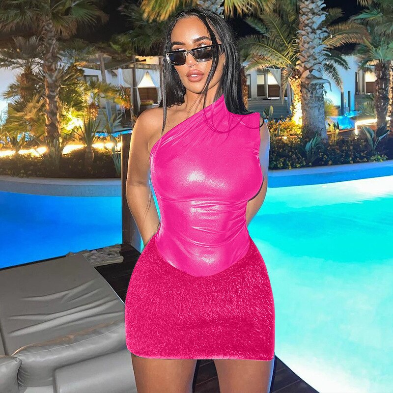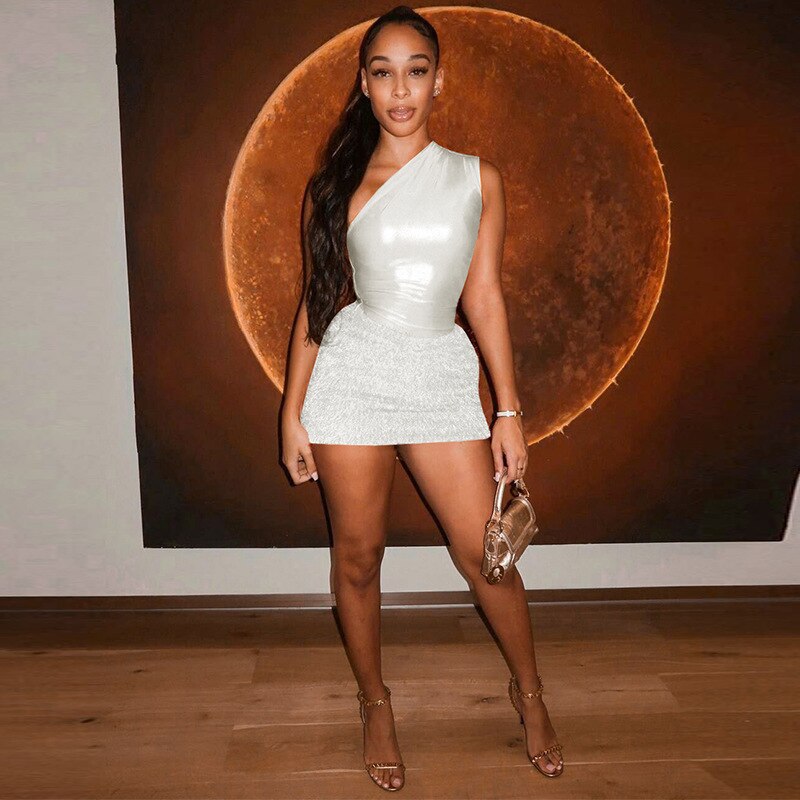 One Shoulder Backless Mini Dress Sexy Club Outfits for Women Two Piece Bodysuit Top and Fuzzy Skirt Sets C70-CI19