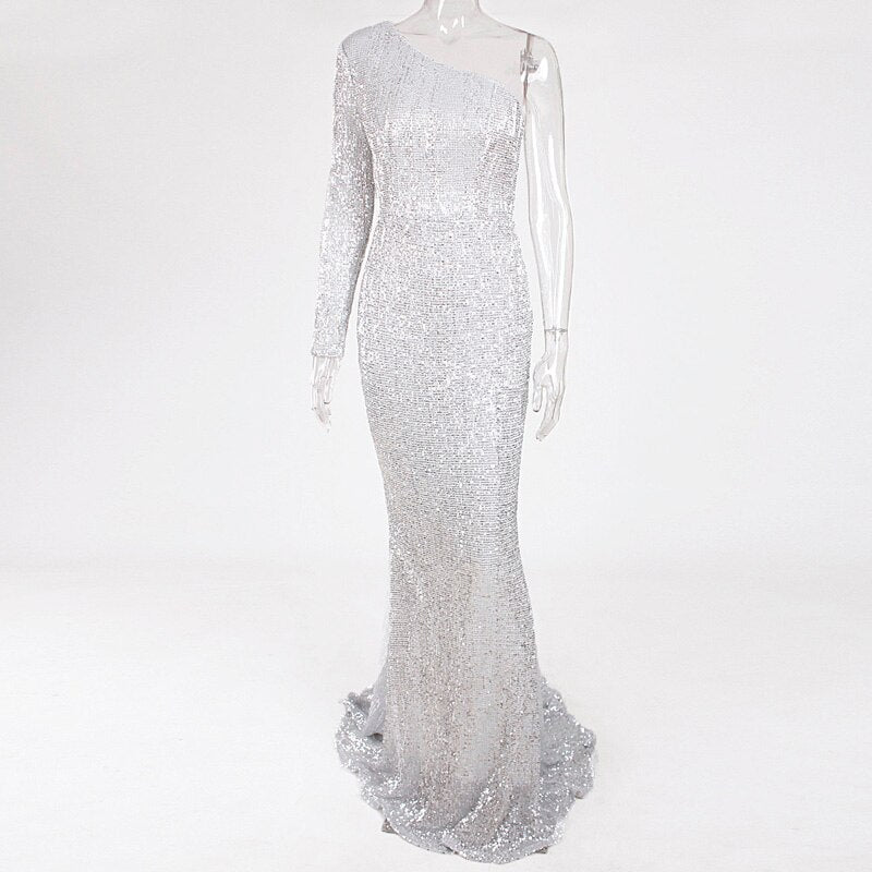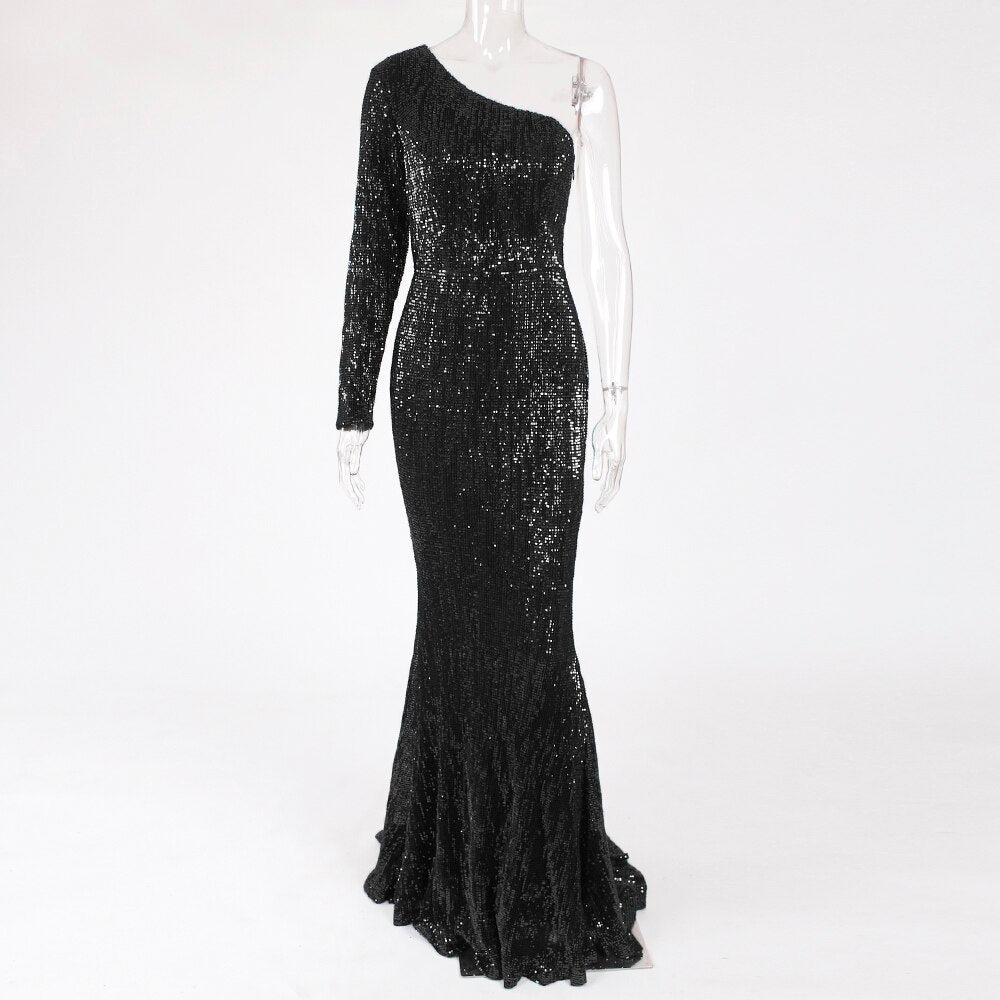 One Shoulder Sequin Night Gown Evening Party Dress Bodycon Floor Length Backless Autumn Luxury Stretchy Mermaid Maternity Dress