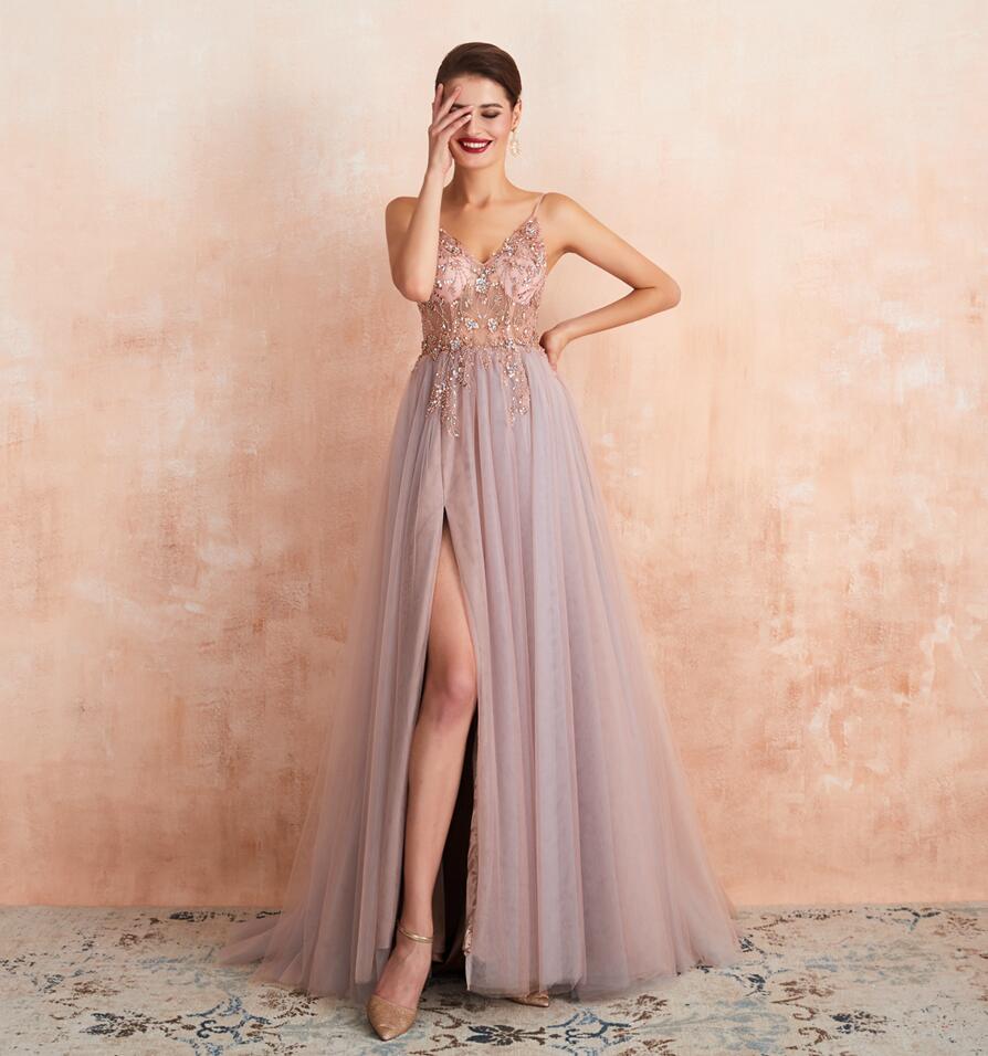 Pink Beaded Prom Dresses Plus Size 2023 Long Elegant See Through A Line Split Tulle V Neck Spaghetti Strap Evening Gown