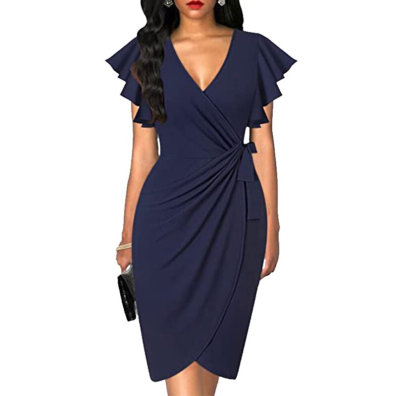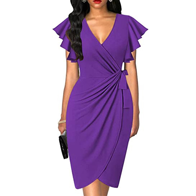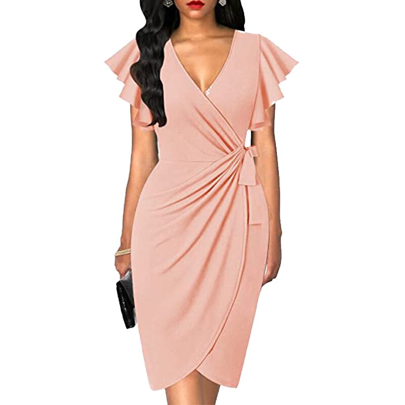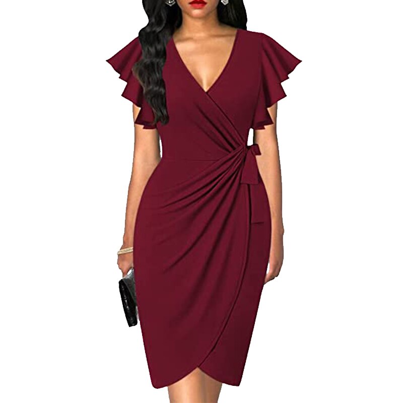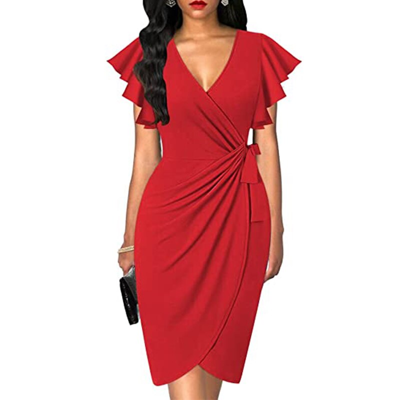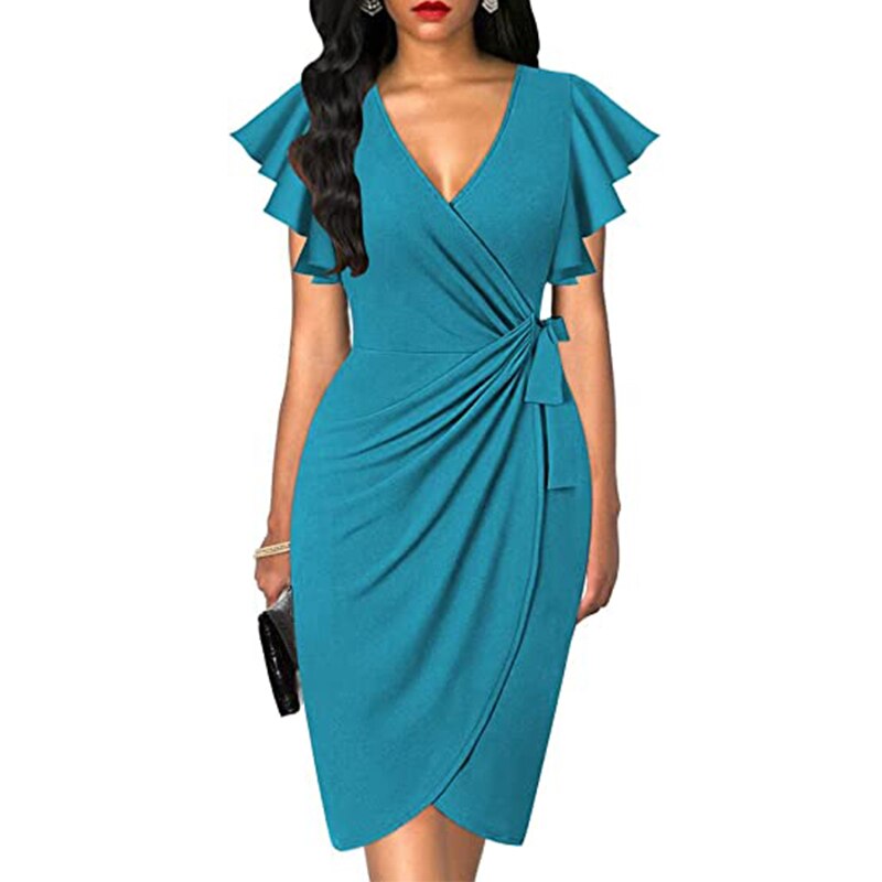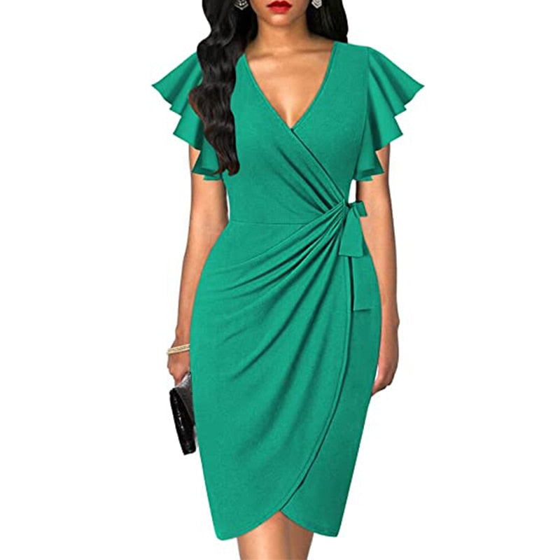 OTEN Women's Deep V-neck ruffle sleeve pleated irregular dress casual summer cocktail party work belt wrap hip dress