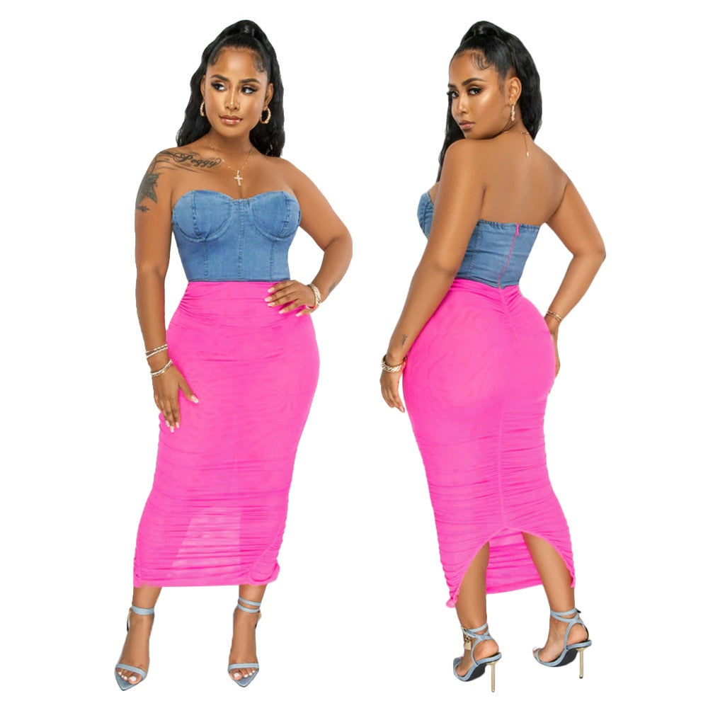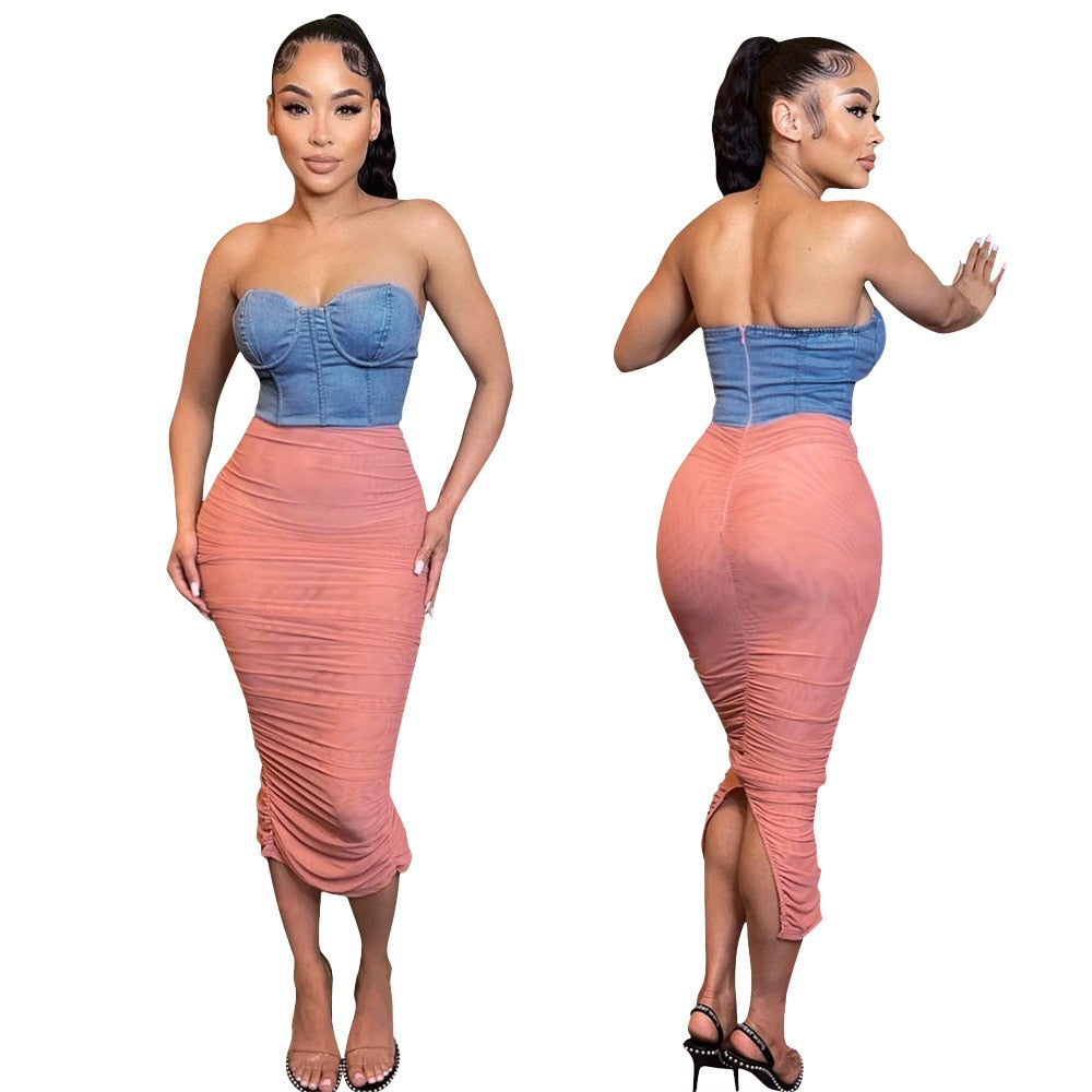 Ruched Mesh Patchwork Jeans maxi Dress women sexy Strapless backless Denim Split party club long dresses outfit streetwear robe