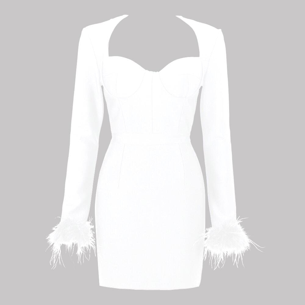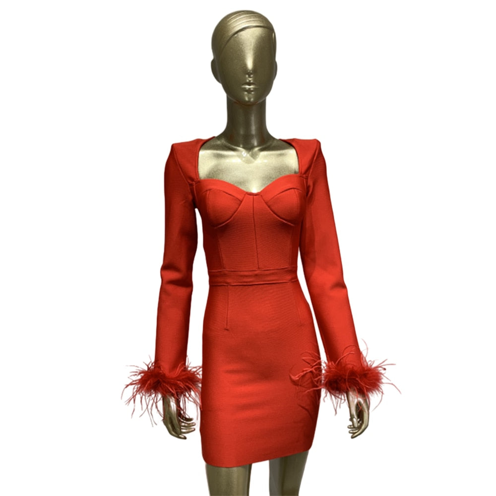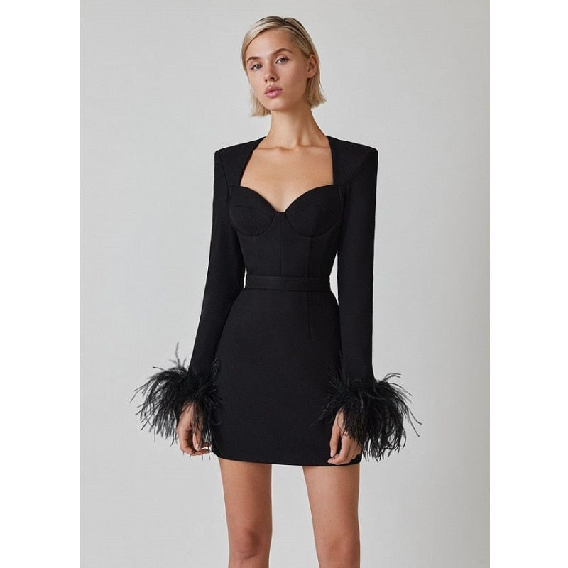 Women Winter Sexy Long Sleeve Feathers Hot Pink Black Mini Bodycon Bandage Dress 2022 Elegant Evening Party Dress