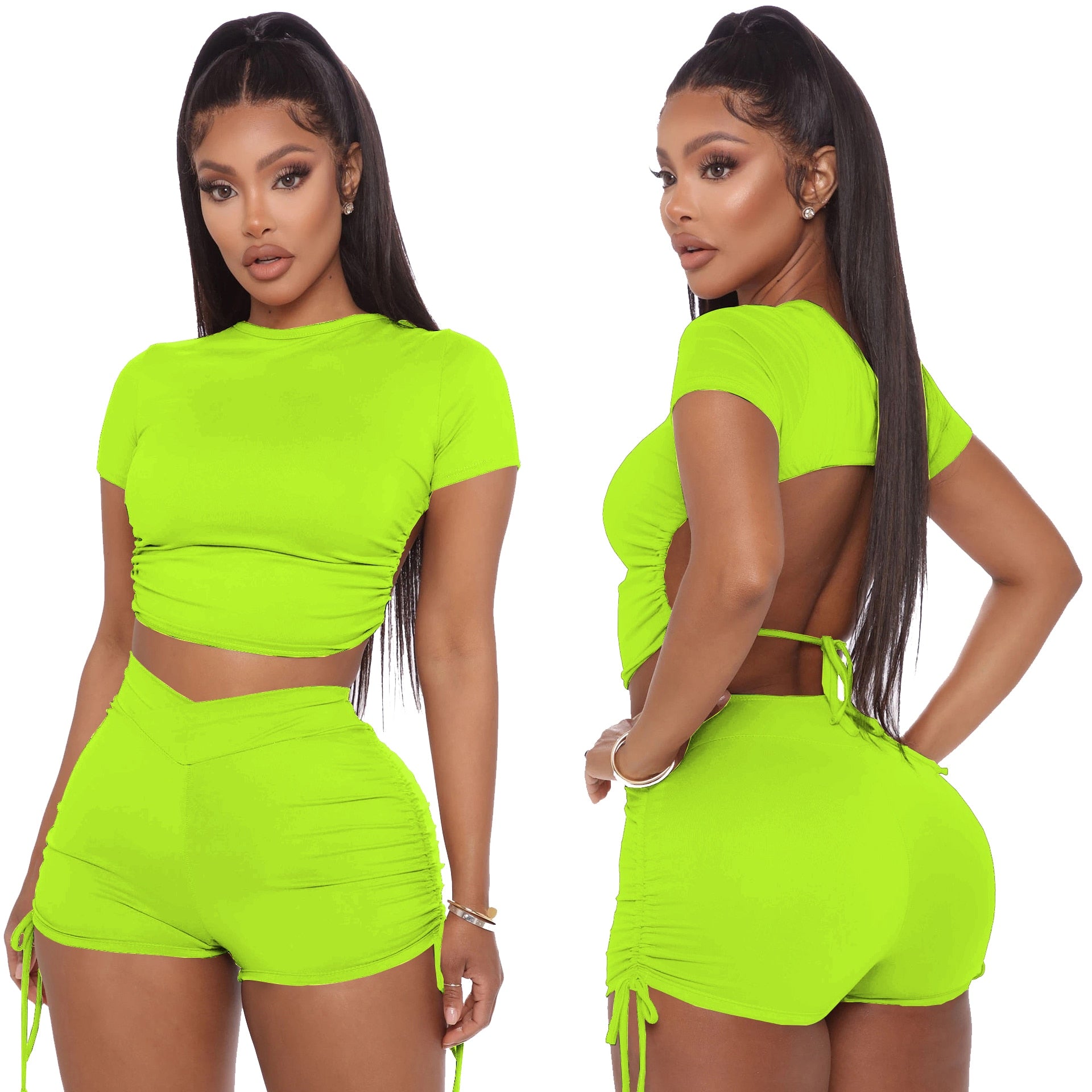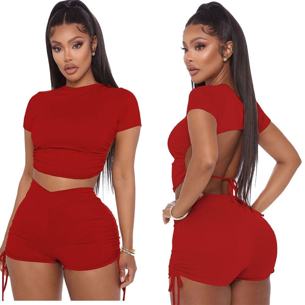 Women Sexy Summer Solid Open Back Crop Top Stacked Shorts Jogger Pnats Suit Two Piece Set