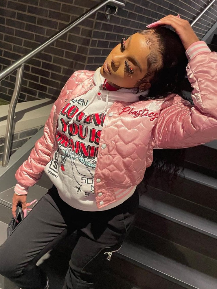 • Fashion Varsity Jacket Women Autumn Winter 2023 Casual Letter Embroidery Quilted Coat Cotton Padded Jacket Streetwear Parkas Red