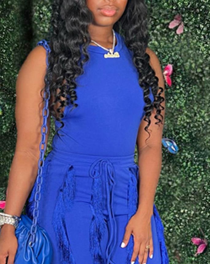 • Fashion Solid Romper Casual Tank Top & Tassel Decor Drawstring Pants Set Skinny Tank Jumpsuits Summer Female Outfit Streetwear