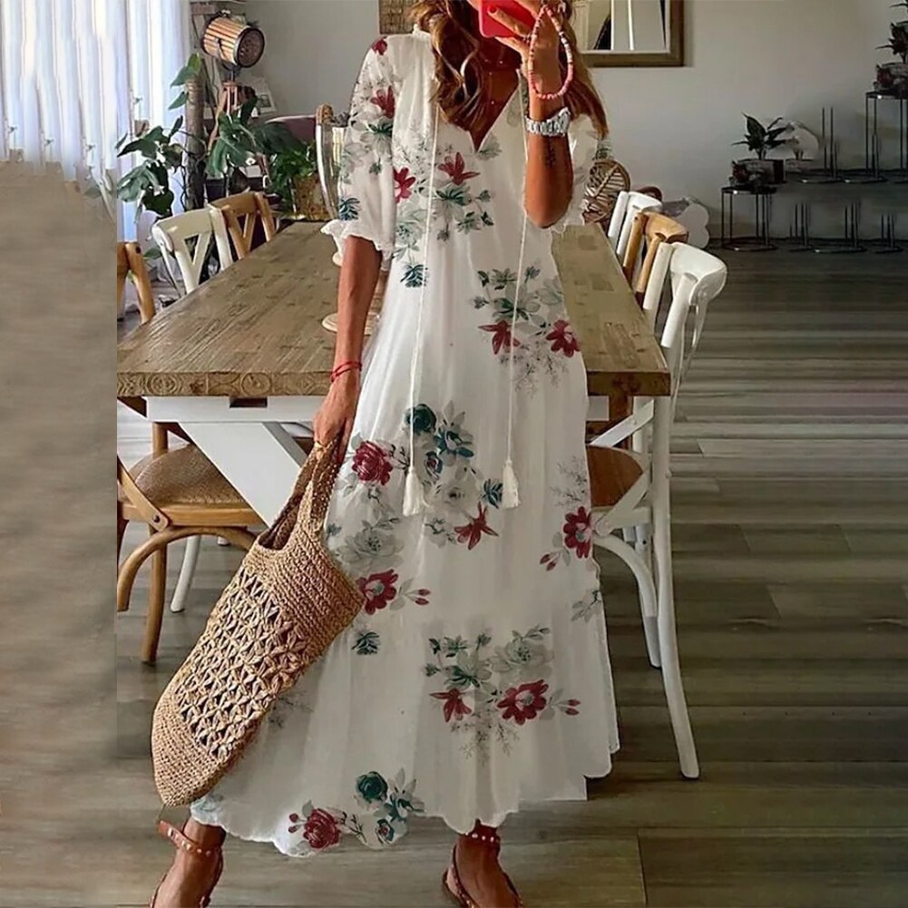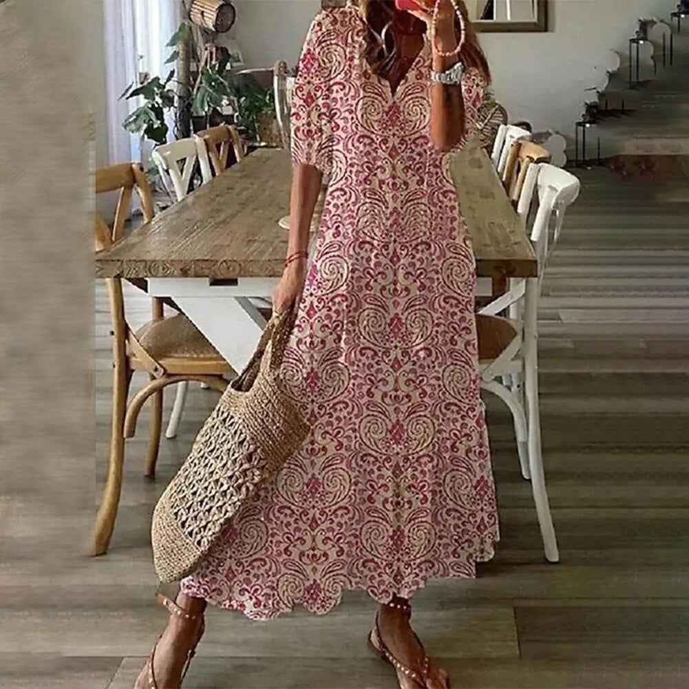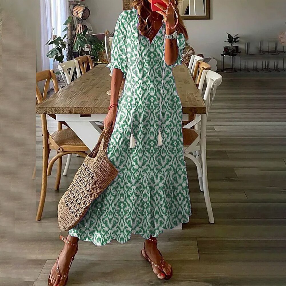 SPECIFICATIONSType: RegularStyle: Beach StyleSleeve Style: OtherSleeve Length(cm): halfSilhouette: LOOSESeason: SummerPlace Of Origin: China (Mainland)Pattern Type: PrintOrigin: Mainland ChinaNeckline: V-NeckModel Number: Bohemian Beach Maxi DressMaterial Composition: Synthetic...