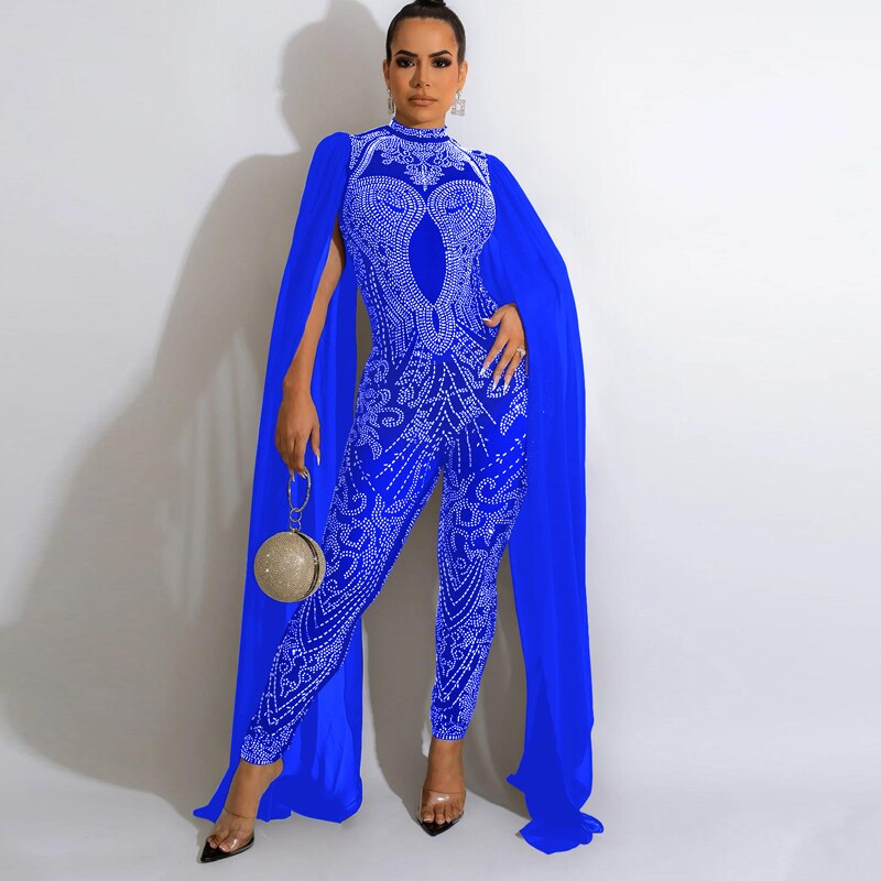 Sexy Beautiful Cape Sleeve Mesh Crystal Jumpsuits Women Rompers Luxury See-Through Outfits