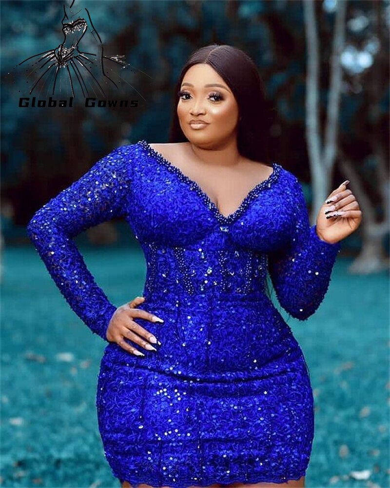 Sexy African Royal Blue V Neck Short Prom Dresses For Black Girls Beaded Sequined