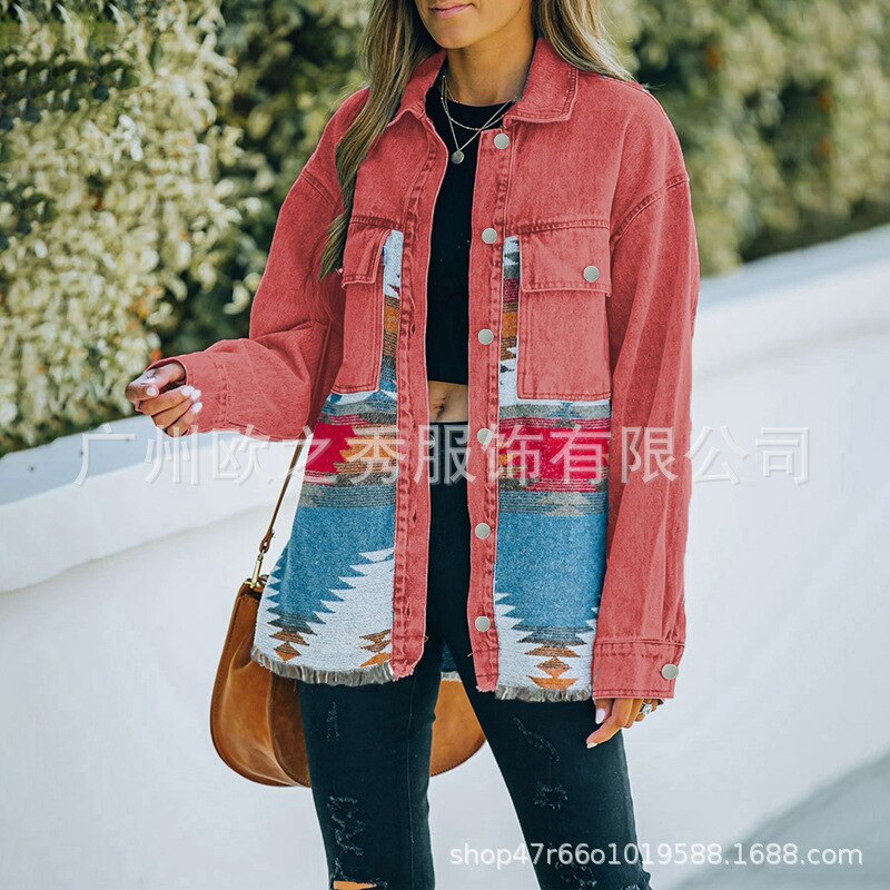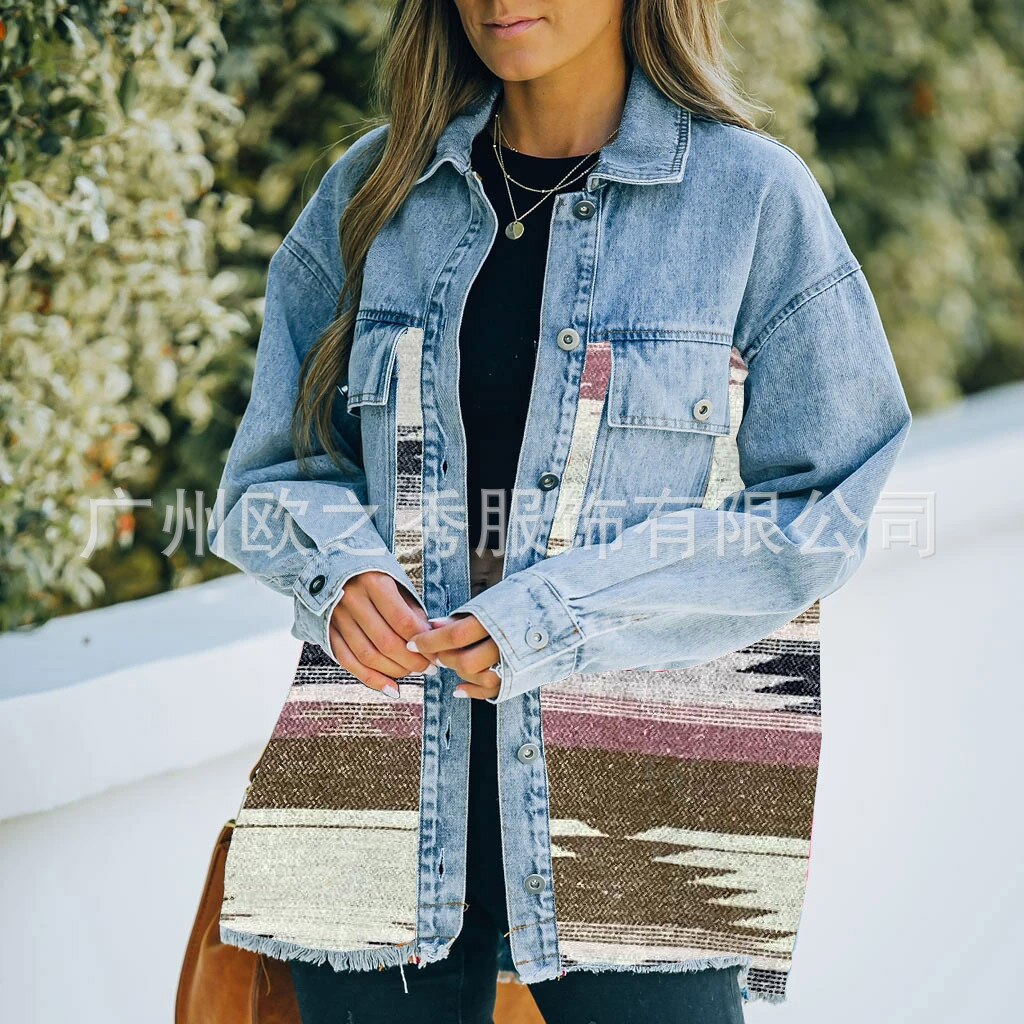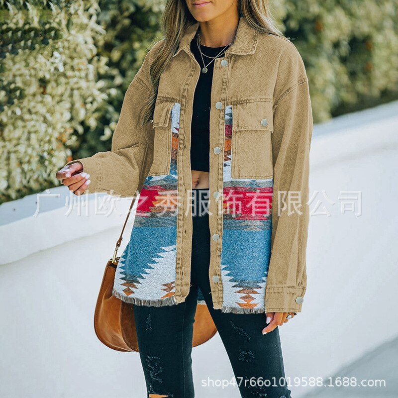 Autumn and Winter New Polo Neck Pocket Denim Panel Wool Coat Women's Vintage Jacket