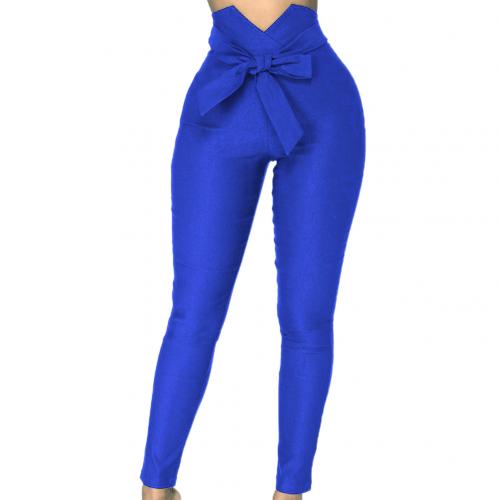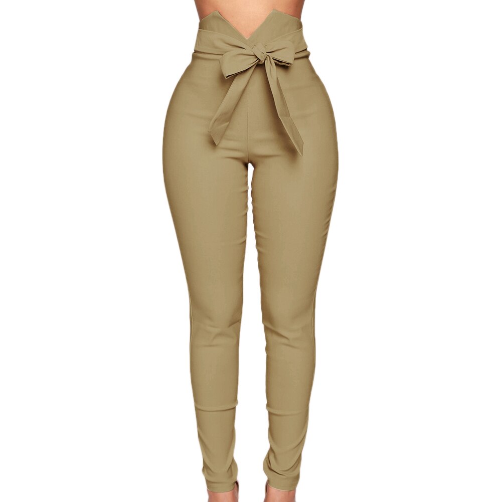 • Chic Lady Solid Color High Waist Bow Belt Elastic Women Pencil Pants Trousers Waist Bow Belt Elastic Slim-Fit Pencil Pants