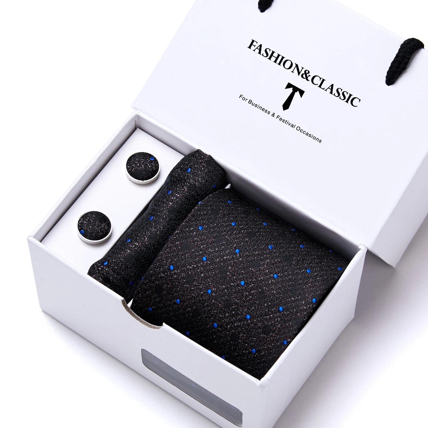 • High Quality 7.5 cm Stripe Blue Tie Pocket Square Cufflinks Set For Men Gift Box Wedding Gravatas Fit Workplace