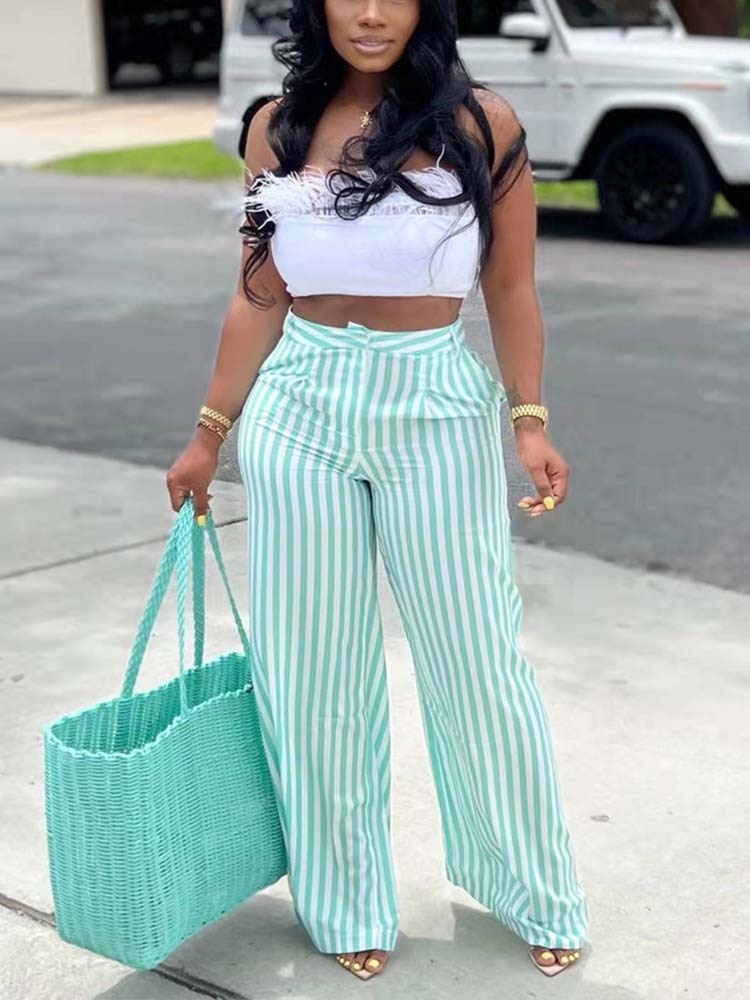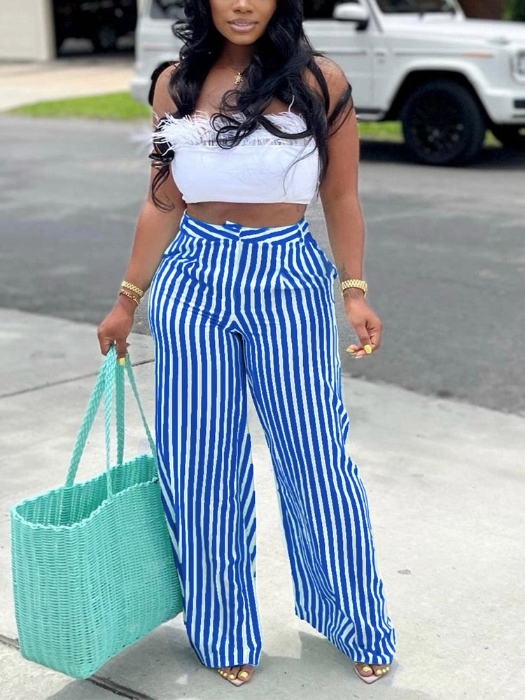 Kadınlar Casual çizgili gevşek pantolon şık Streetwear pantolon