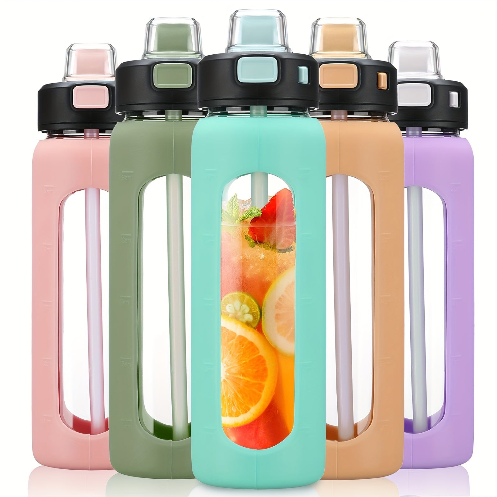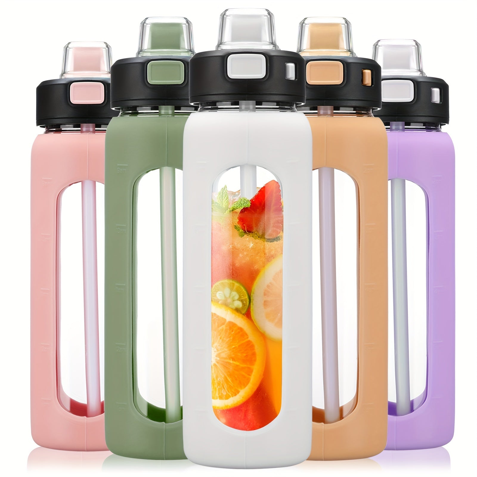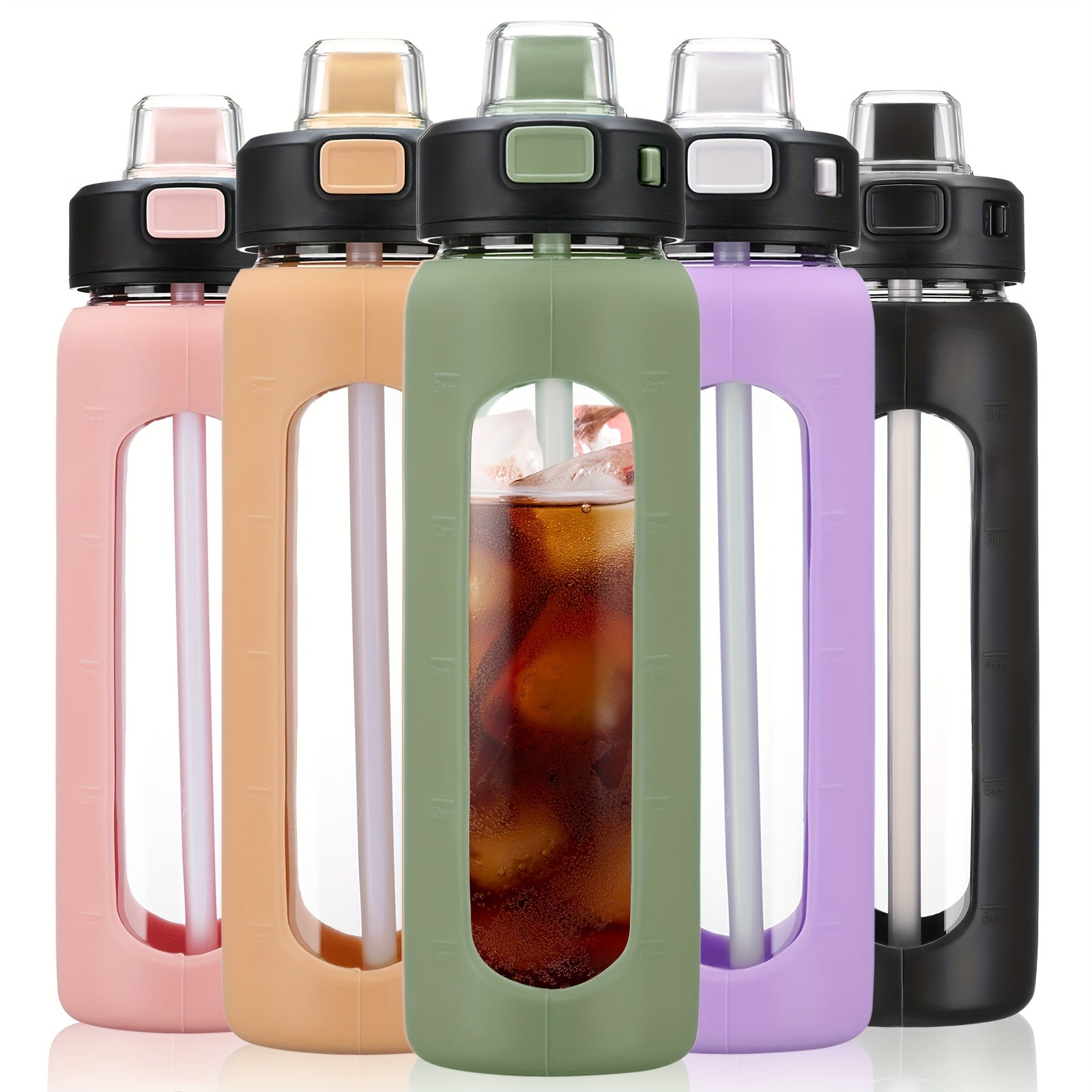 MUKOKO 24oz Glass Water Bottle With Straw, Motivational Water Bottles With Time Marker And Silicone Sleeve, Glass Bottle With Locking Lid And Carry Loop