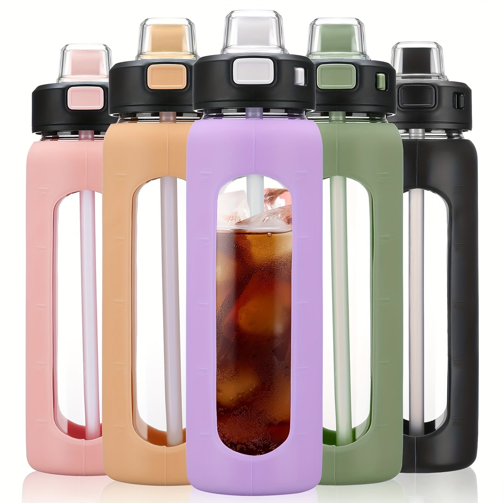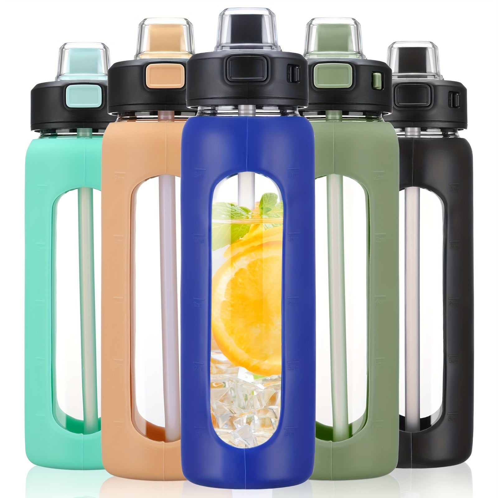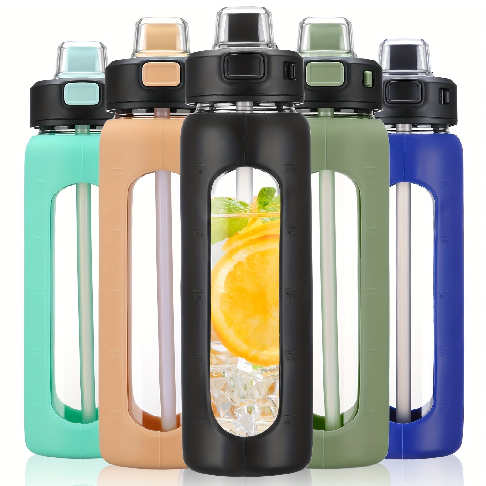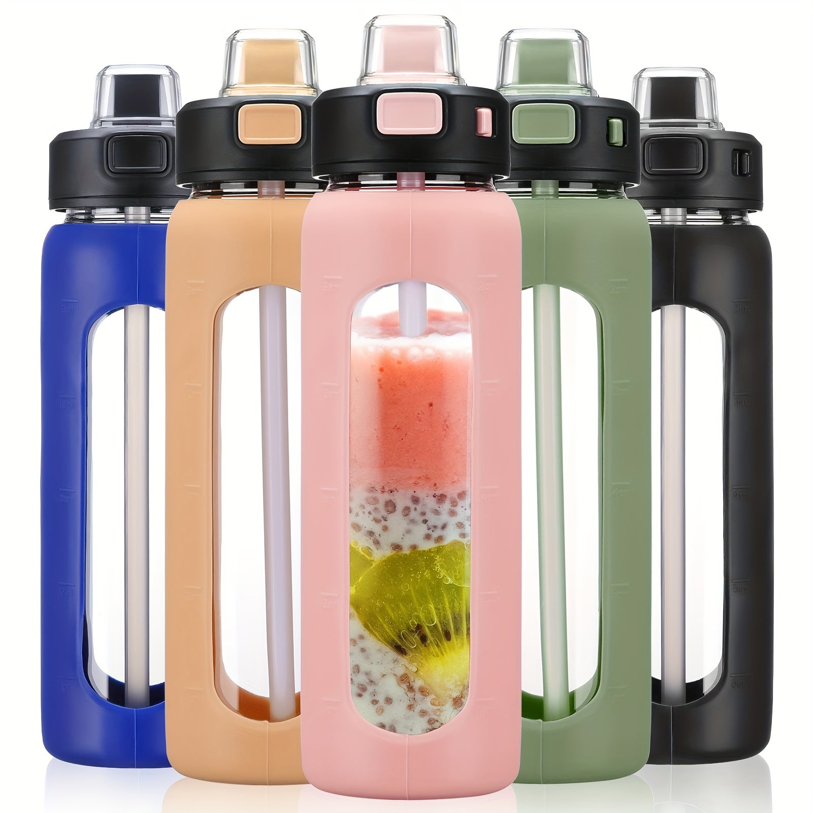 MUKOKO 24oz Glass Water Bottle With Straw, Motivational Water Bottles With Time Marker And Silicone Sleeve, Glass Bottle With Locking Lid And Carry Loop