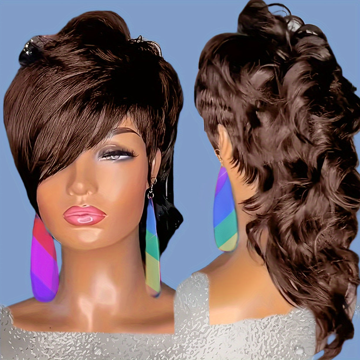 [Heat Resistant Mullet Wig] 180% Density Heat Resistant Synthetic Hair Wig - Chic Pixie Cut Mullet for Women - Long Wavy Style with Bangs, Beginner-Friendly, Voluminous Body Wave Texture