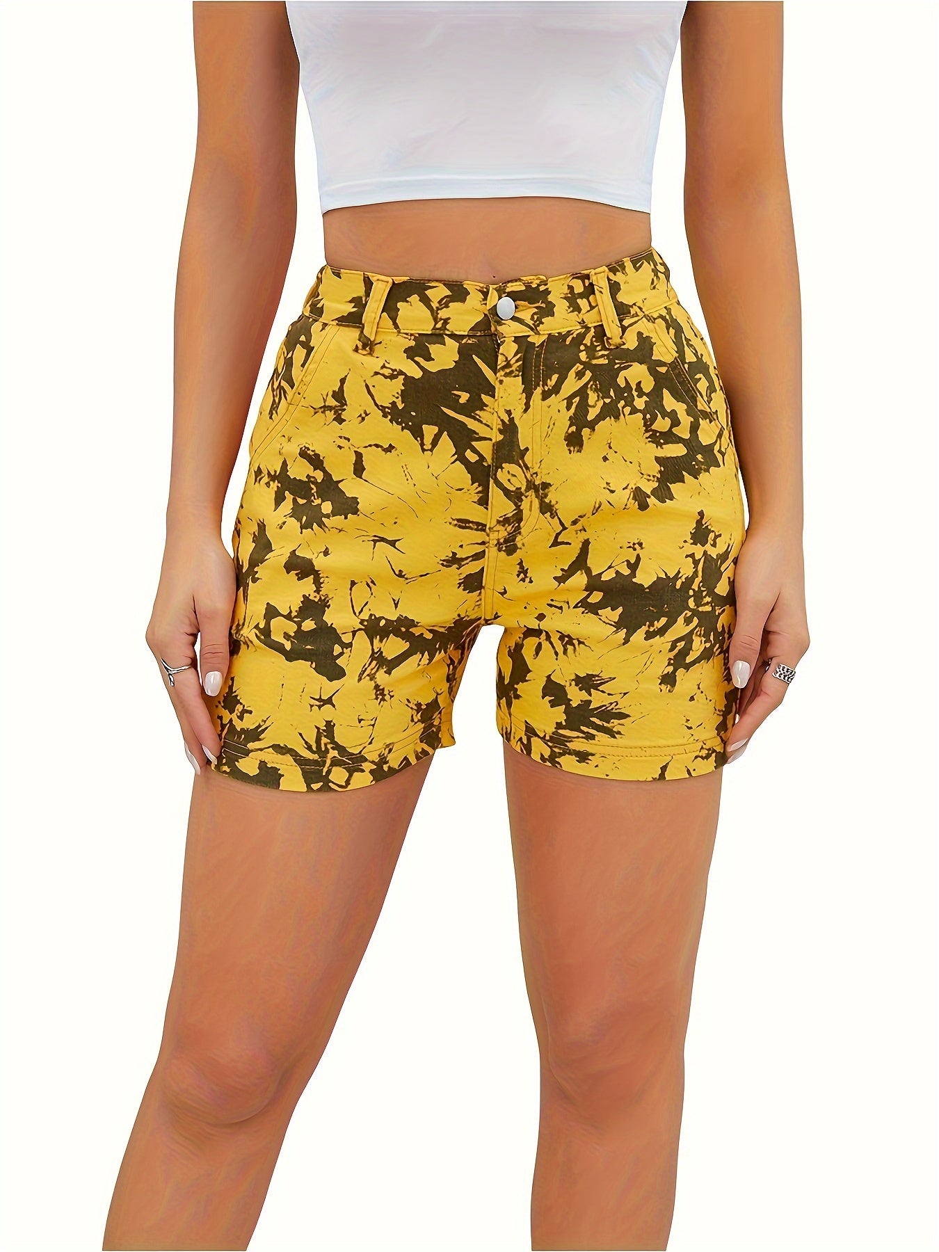 Women's High Waist Camouflage Print Denim Shorts, Elastic Streetwear Style, Casual Summer Hot Pants with Pockets