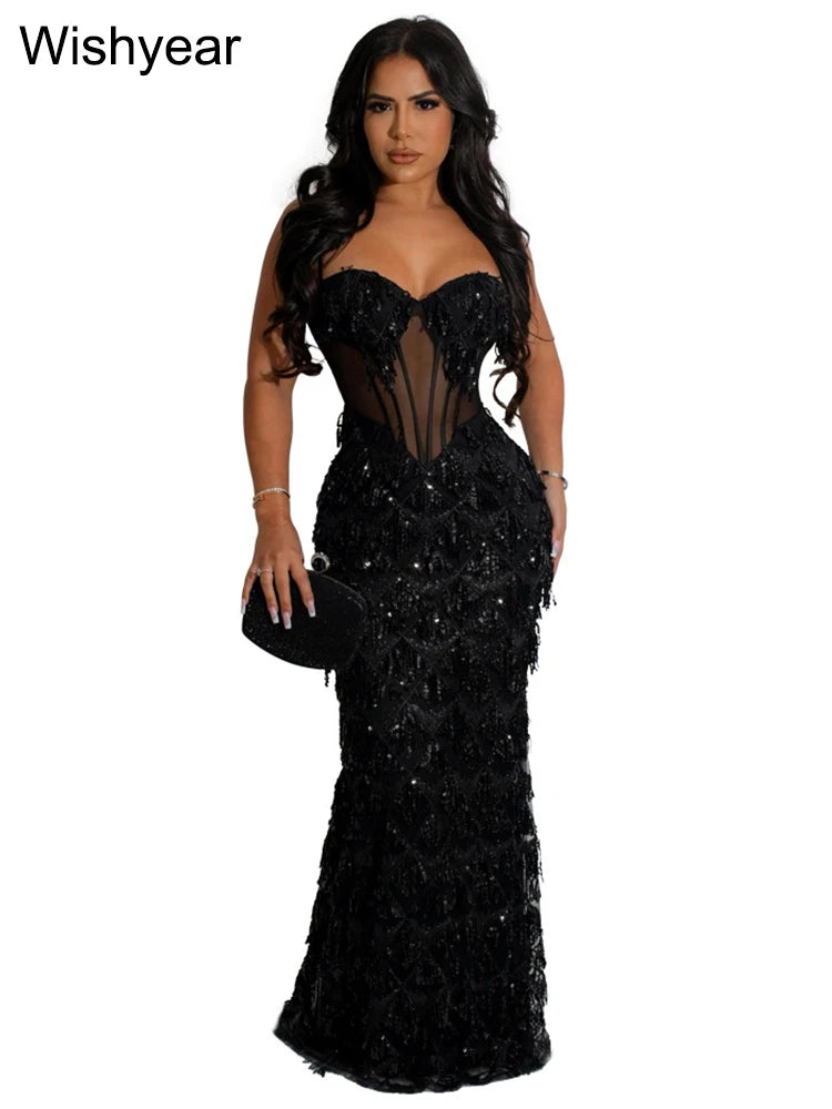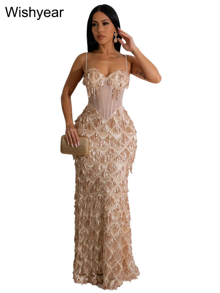 Sexy Spaghetti Strap Backless Bodycon Evening Club Party Dresses for Women Elegant Tassel Sequined Long Dress Birthday Femme