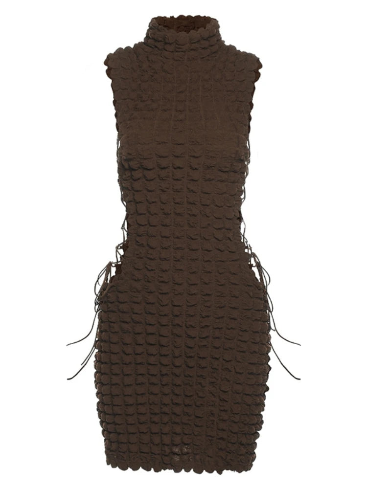 Kliou Stunning Stacked Mini Dress Women Sexy Solid Mock Neck Sleeveless Draw String Bodycon Party Clubwear Elegant Female Skirt