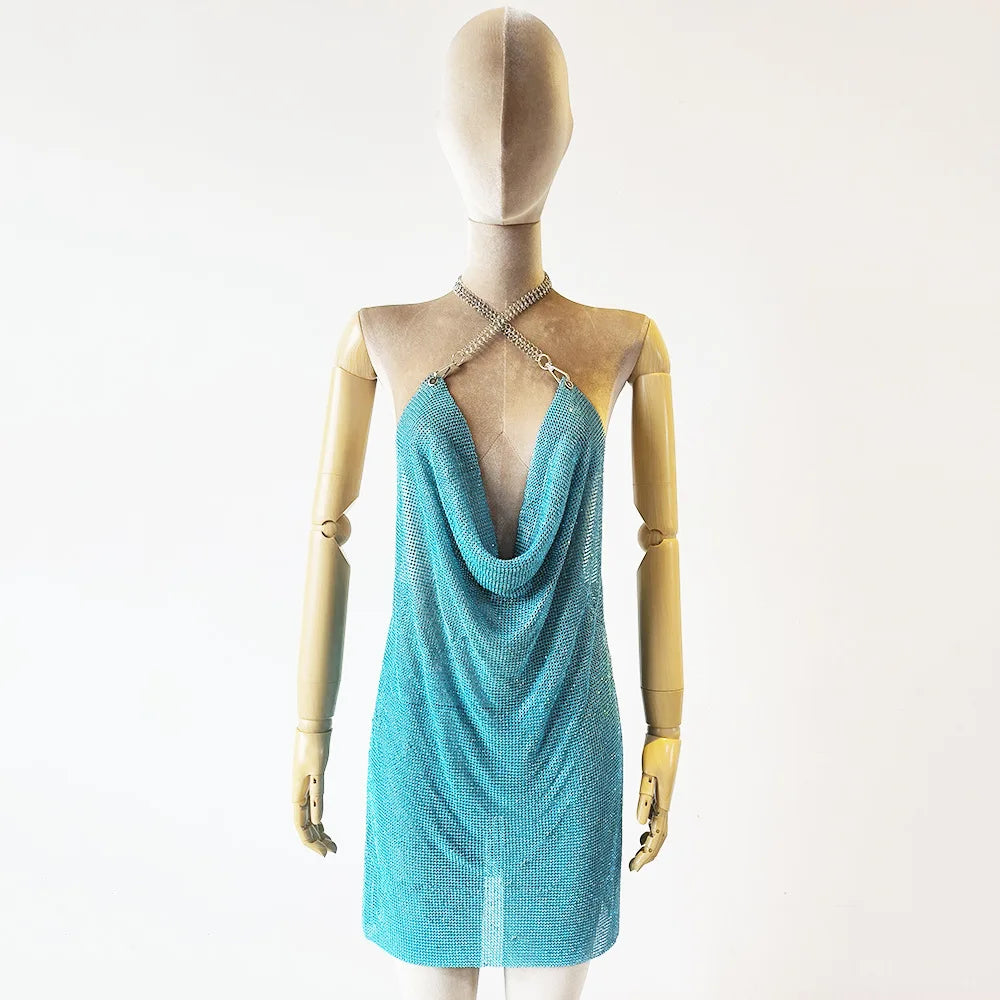2023 Fashion Sexy Sequin Patchwork Dress Women Sleeveless Low Cut Metal Chains Halter Slim Charming Nightclub Party Mini Dresses
