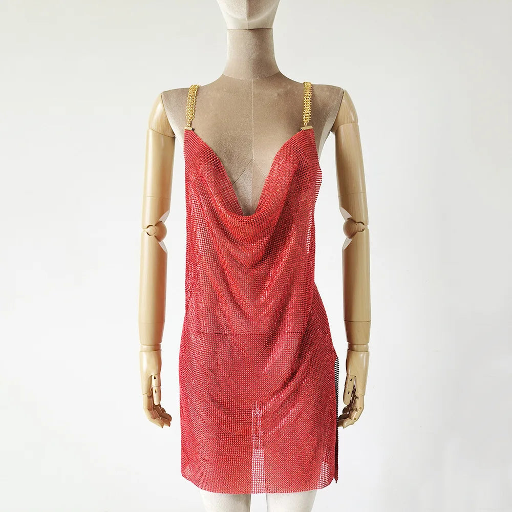 Spice Girl-Women's Spice Girl's Metal Rhinestone Mini Skirt Sling Backless Side Slit Cocktail Party Dress 8-Character Chain