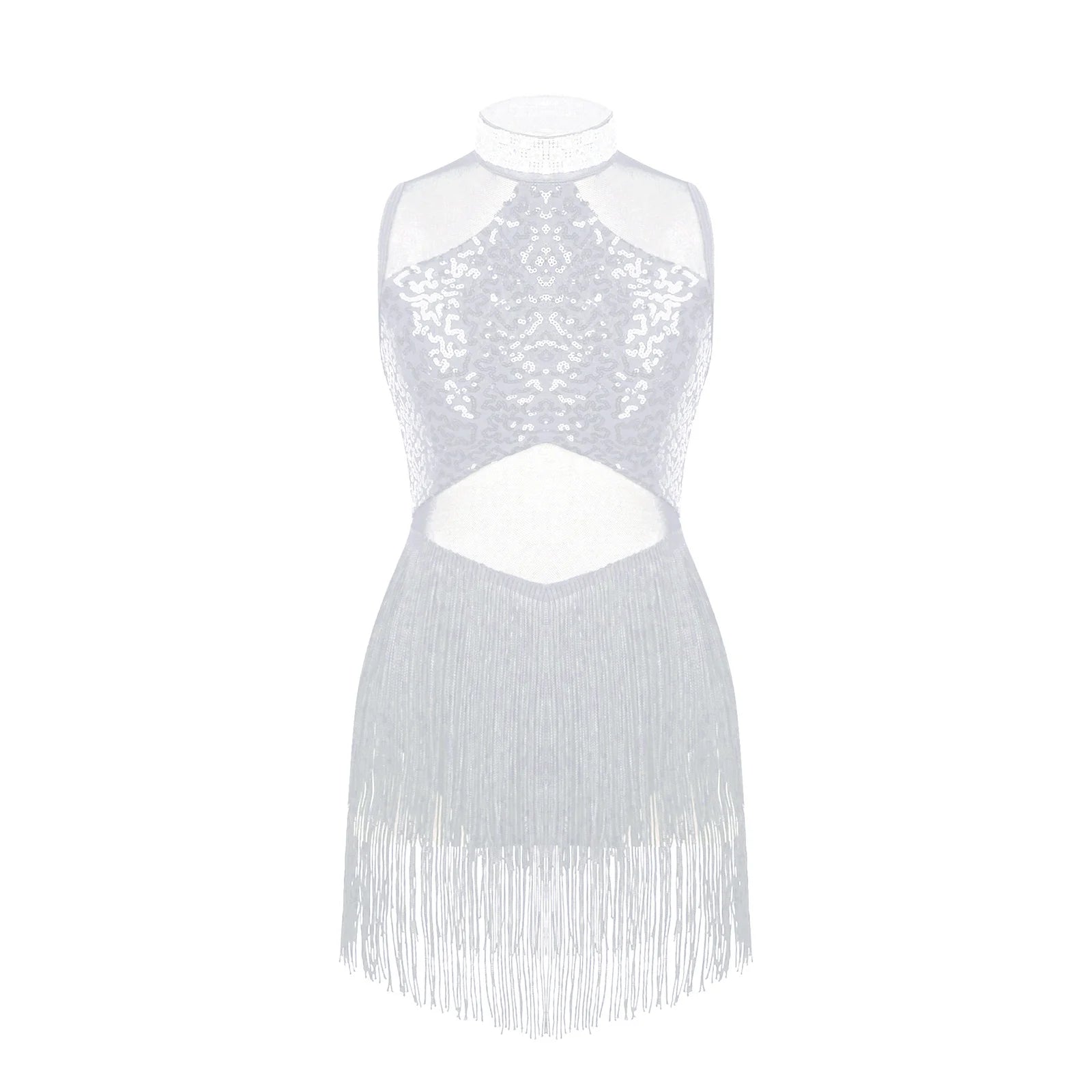 Women Tassel Latin Jazz Salsa Leotard Dance Dress Tango Dance Costumes Sheer Mesh Patchwork Rhinestones Fringed Bodysuit Dress