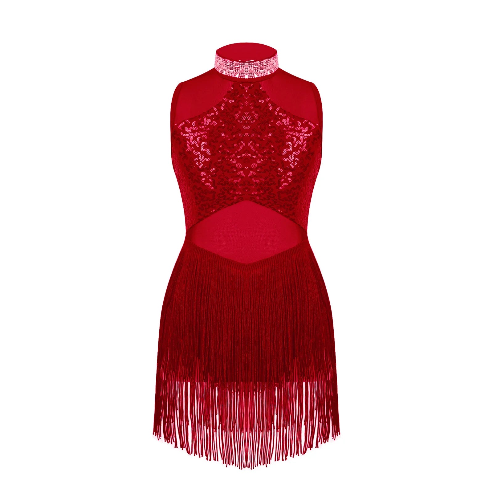 Girls Shiny Rhinestone Jazz Ballet Dance Dress Decorated Collar Sequins Mesh Tassel Hem Dance Leotards Dance Performance Dress