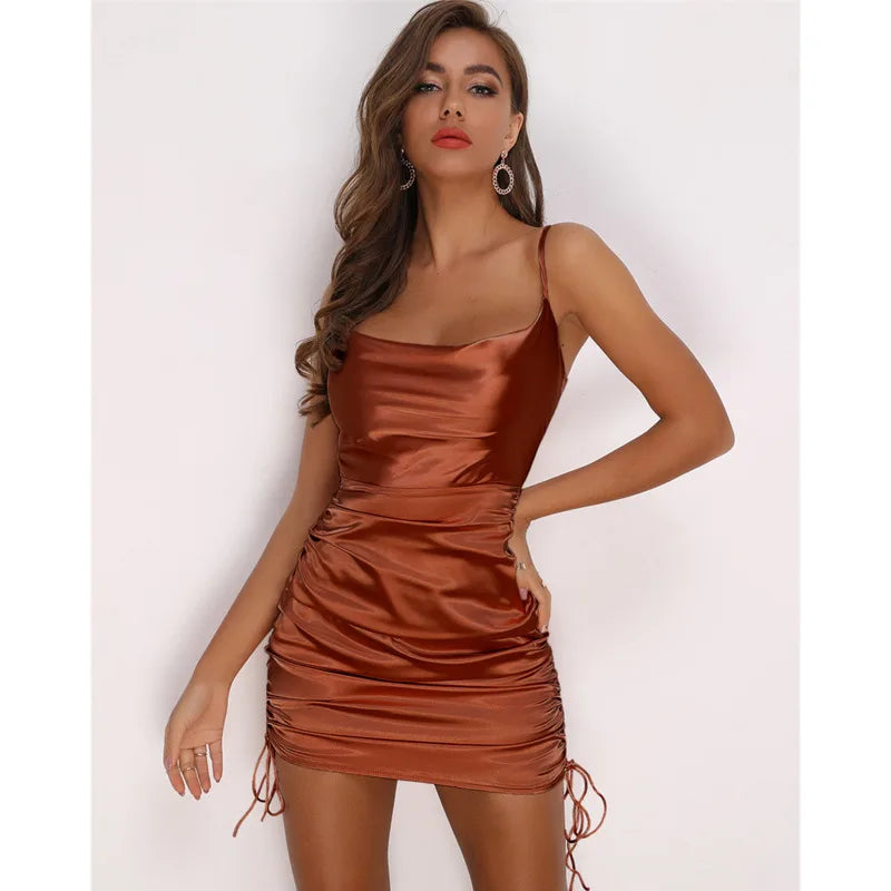 Josiaoprah Satin Mini Summer Dress Women Ruched Pleated Sleeveless Short Beach Dress Drawstring Casual Dress Female Vestidos