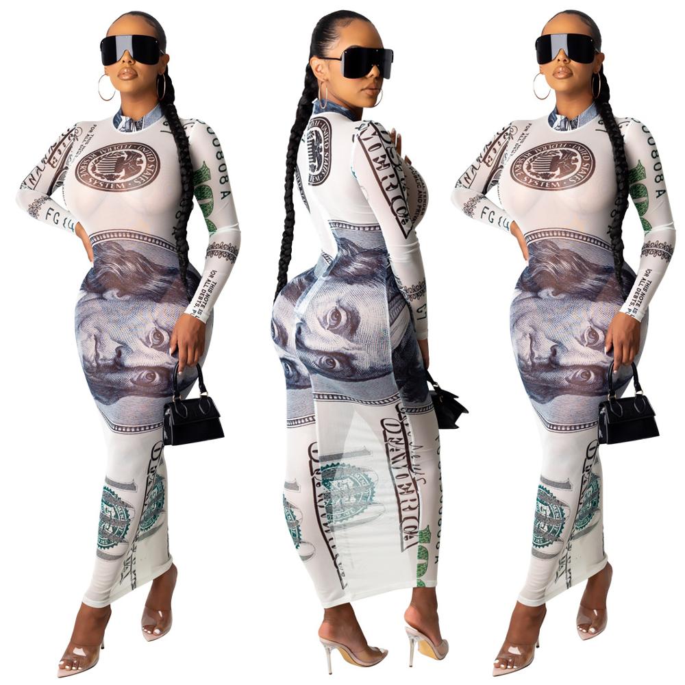 Print Sexy Mesh Long Sleeve Party Dress Women See Through Clubwear Skinny Autumn Bodycon Maxi Dresses Slim Turtleneck
