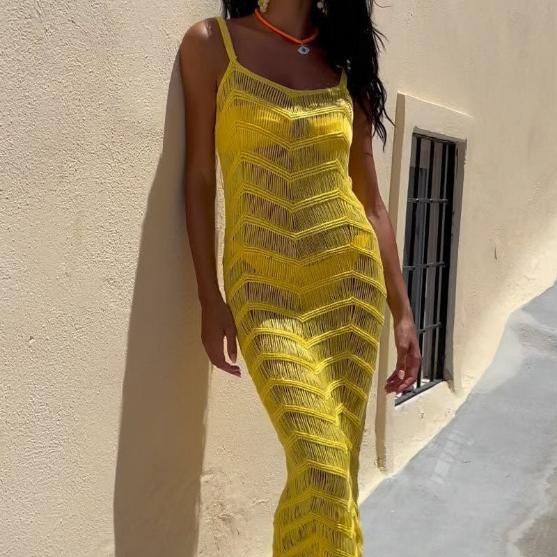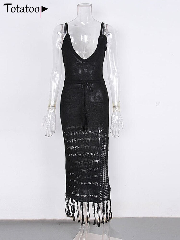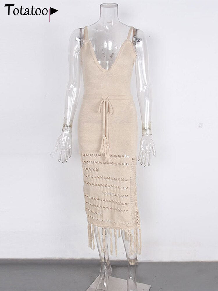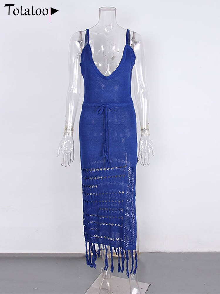 Totatop Beach Boho Knit Maxi Dress Women 2022 Summer Strap V Neck Drawstring Hollow Out Crochet Tassel Split Cover Up Swim Dress