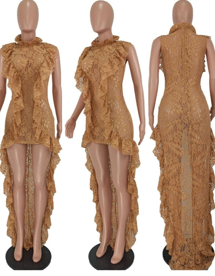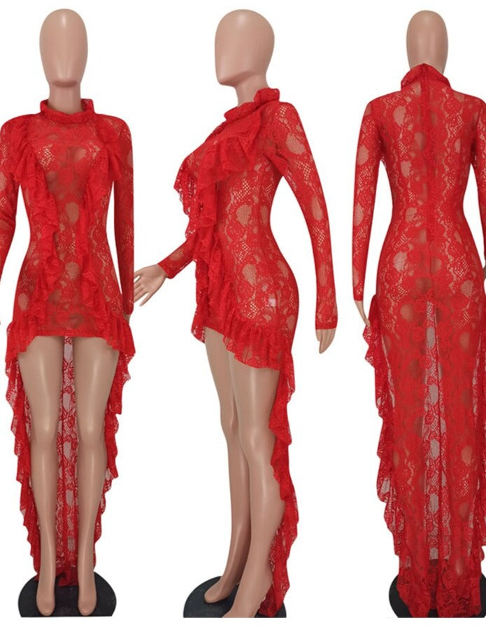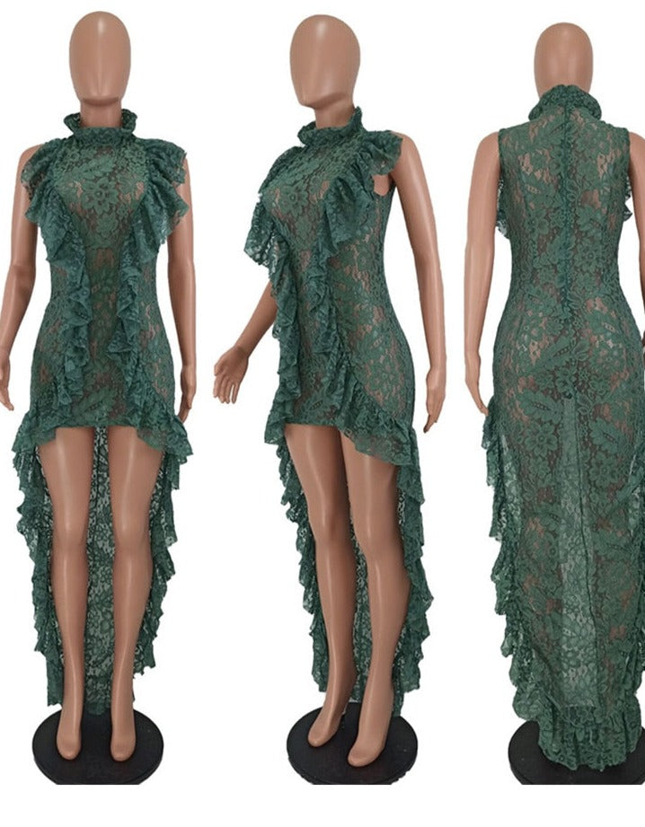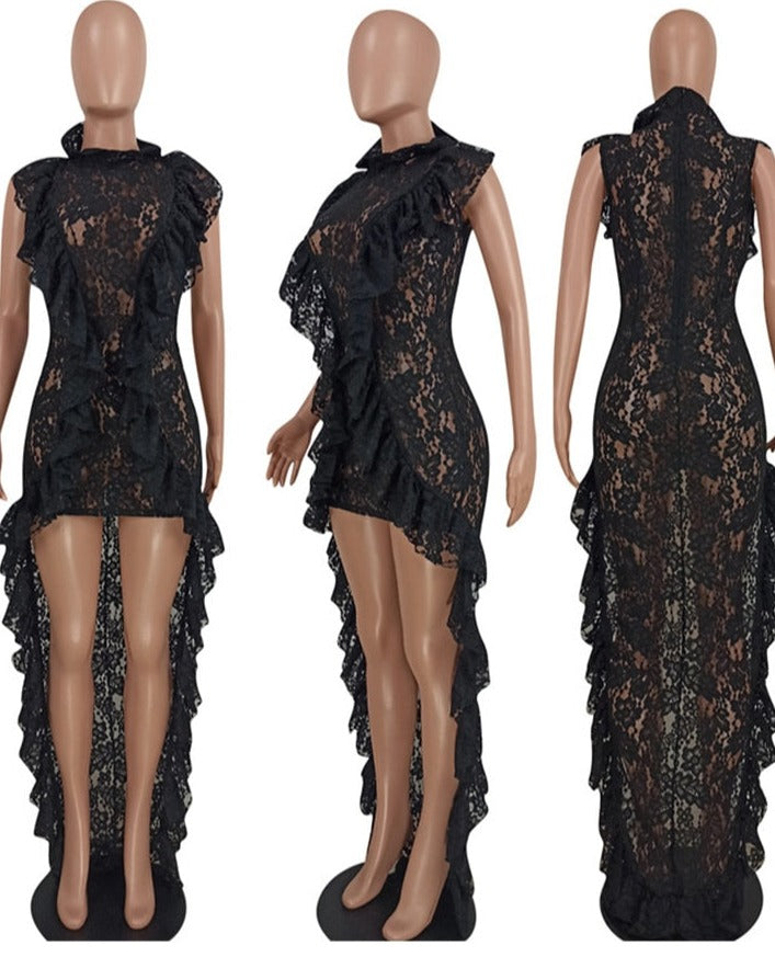 2023 Sexy Floral Lace Sheer Cocktail Evening Dresses for Women Ruffles Hem Bodycon Maxi Dress