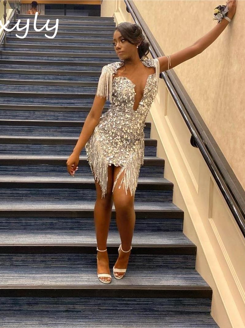 Sparkle Silver Sequin Prom Dress For Black Girls Sheer Neck Beaded Tassel Short Evening For Cocktail Party Luxe Graduation Wear