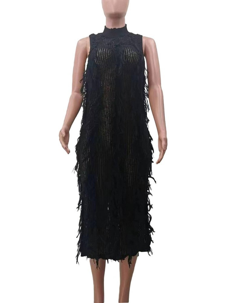 Sexy 2023 New Women Crochet Knit Tassel Beach Maxi Dresses Turtleneck Sleeveless Cover Up