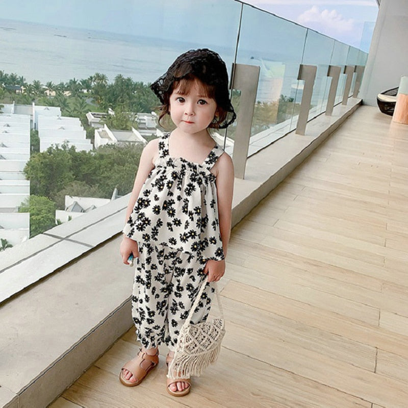 Summer Girls' Clothing Sets Back Cross Flower Suspender Top+ Nine-Point Pants Baby Children Clothes Suit Fashion Kids Outfit