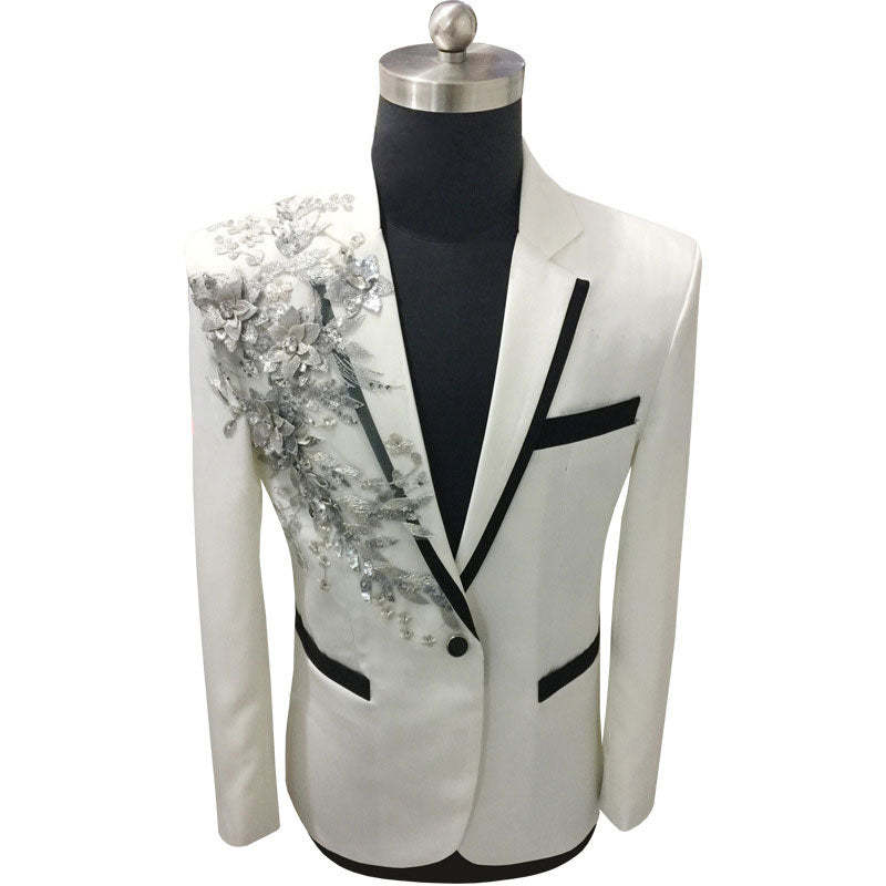 • White Floral Sequin Embroidery Suit Jacket Men Wedding Groom Tuxedo Suit Blazers Mens One Button Peak Lapel Stage Costume Homme