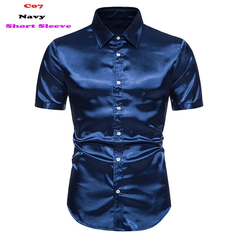 Royal Blue Silk Satin Shirt for Men 2023 Luxury Brand New Slim Fit