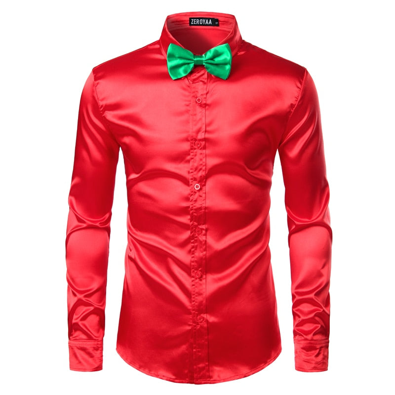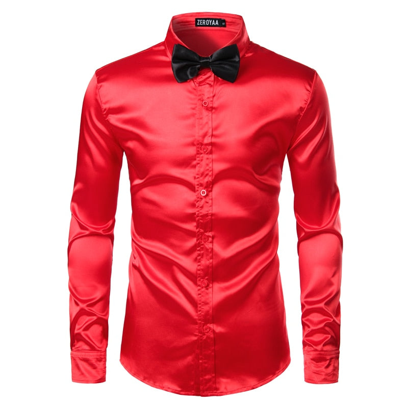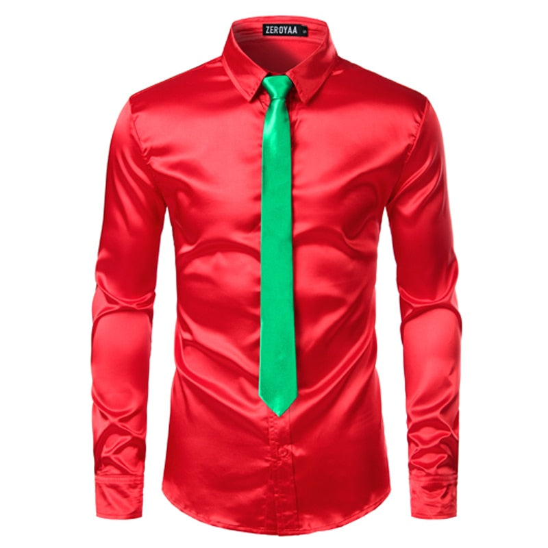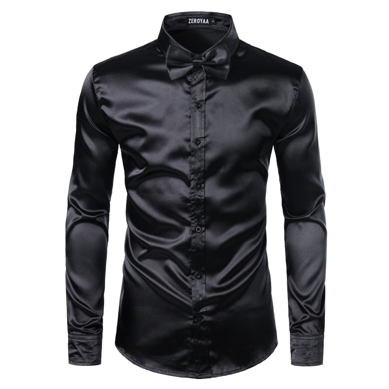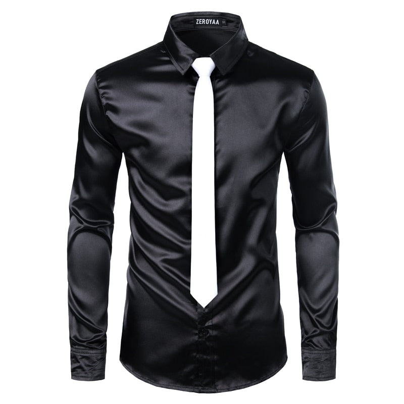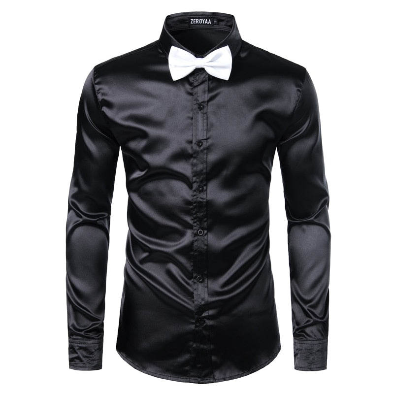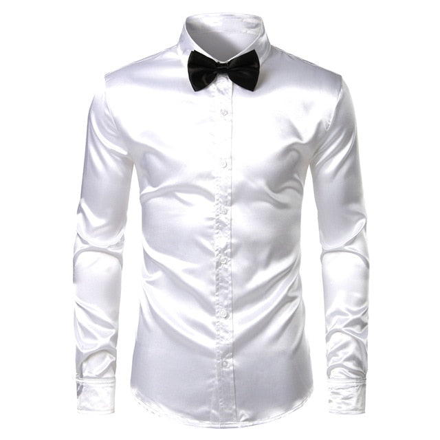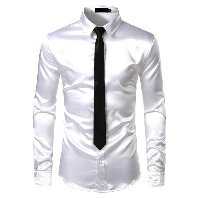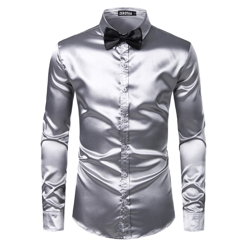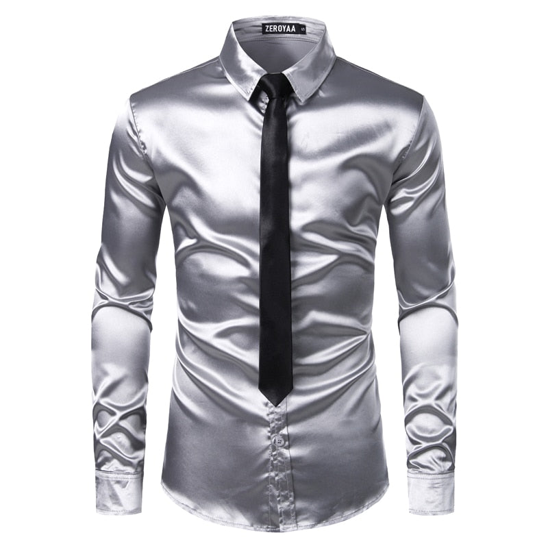 2pcs Silver Silk Shirt+Tie Mens Satin Smooth Tuxedo Shirts
