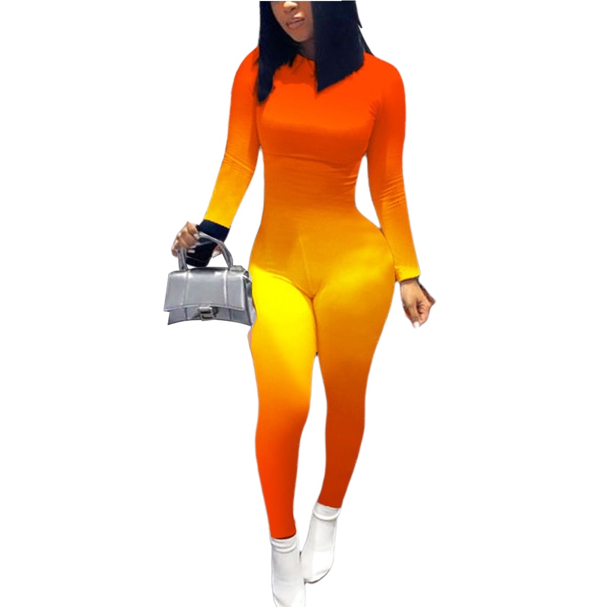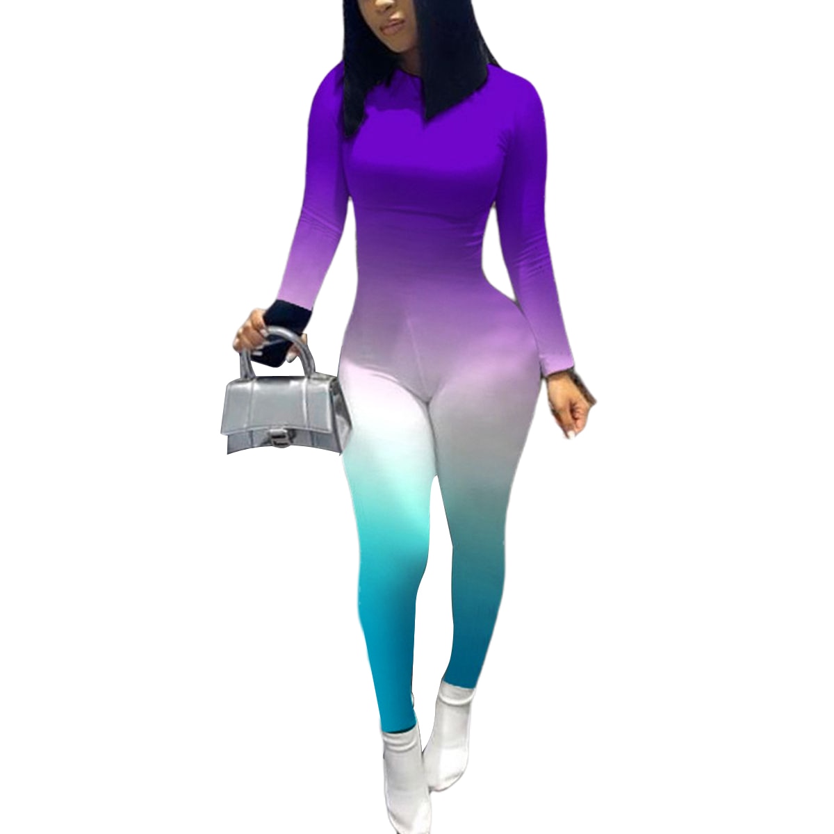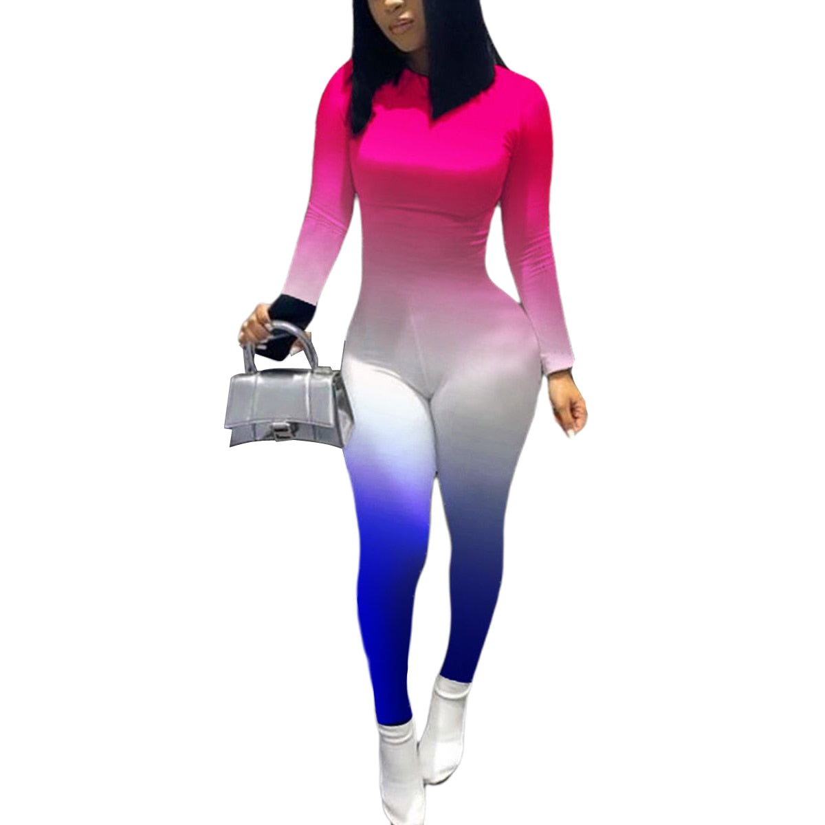 Skinny Long Sleeve Print Patchwork Skinny Fluorescent Jumpsuit Women New Sporty Wear Long Pant Jumpsuits S-XL