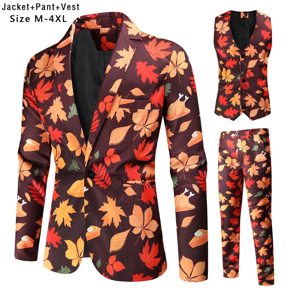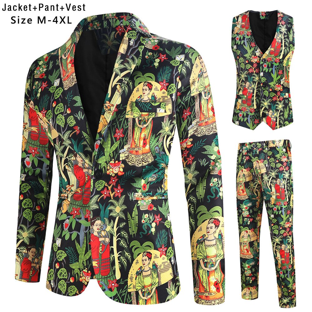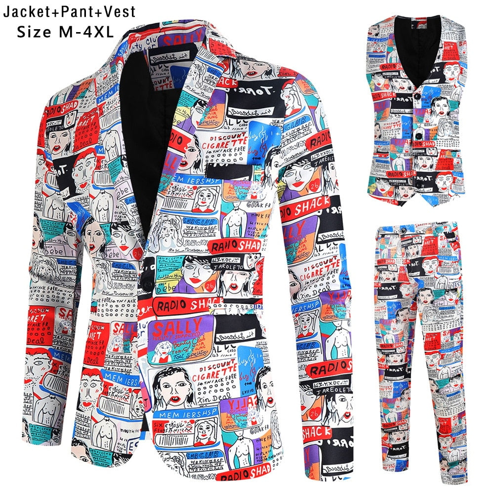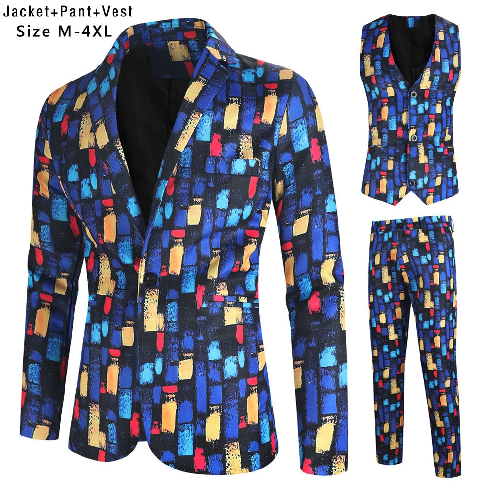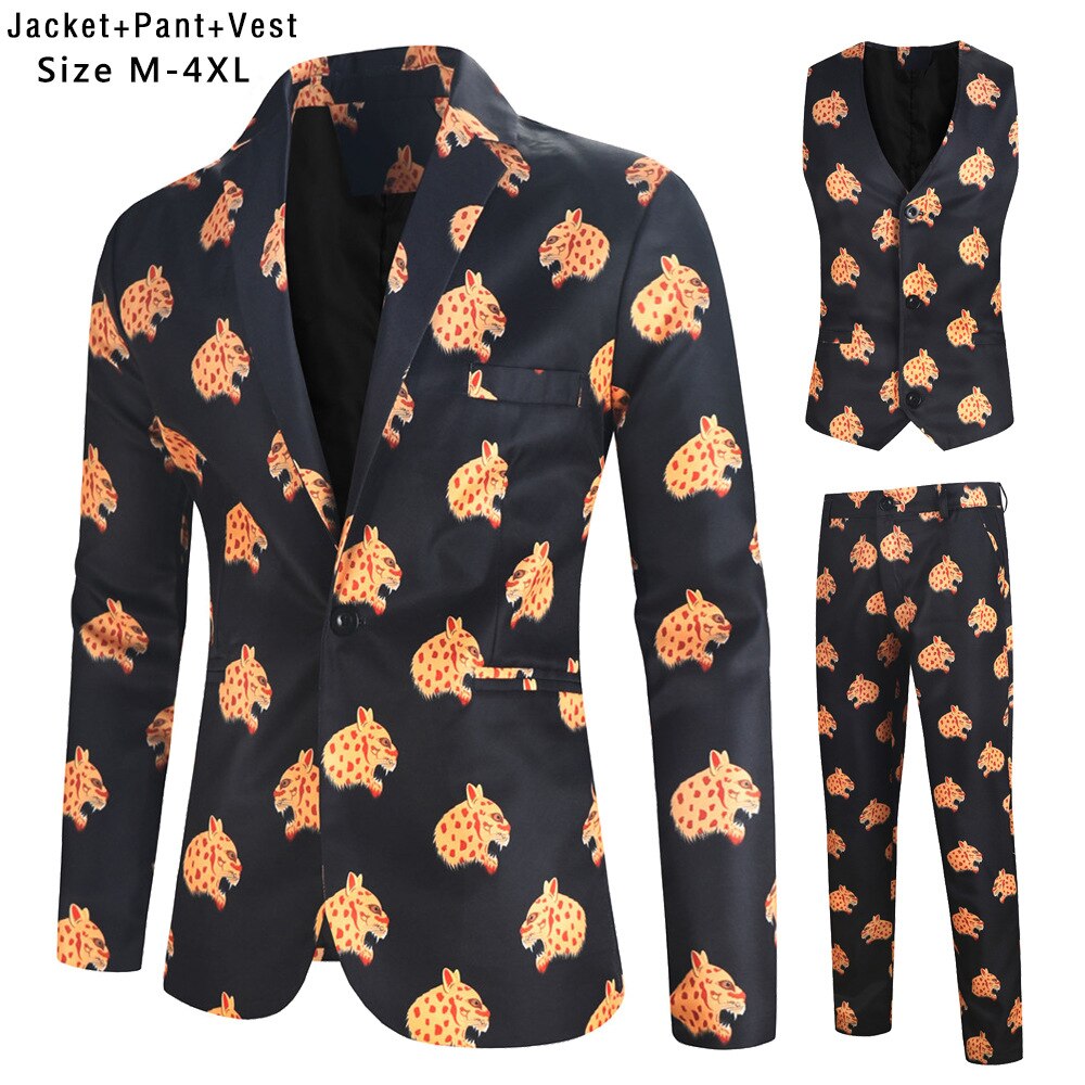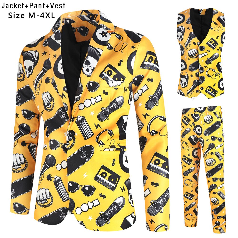 Fashion Hip Hop Printed Yellow Blazer Sets Men (Jackets + Pants + Vest ) Autumn Spring Club Prom 3 Pieces Suits Terno Masculino