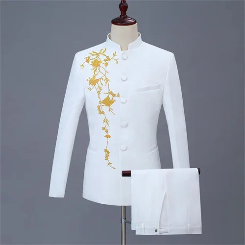 New Men Stand Collar Embroidery Suit 2 Piece Black / White / Red Fashion Male Stage Party Perform Blazer and Trousers