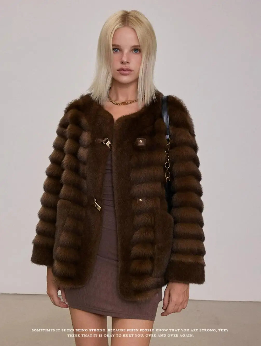 Winter Contrast Color Brown Horizontal Strip Faux Mink Fur Coat Women O neck Front Buckle Buttons Loose Thick Short Outerwear