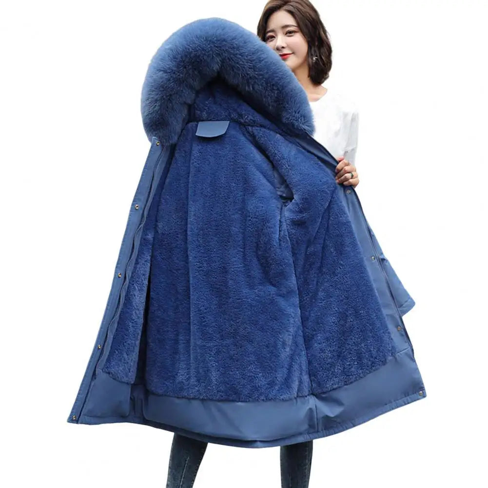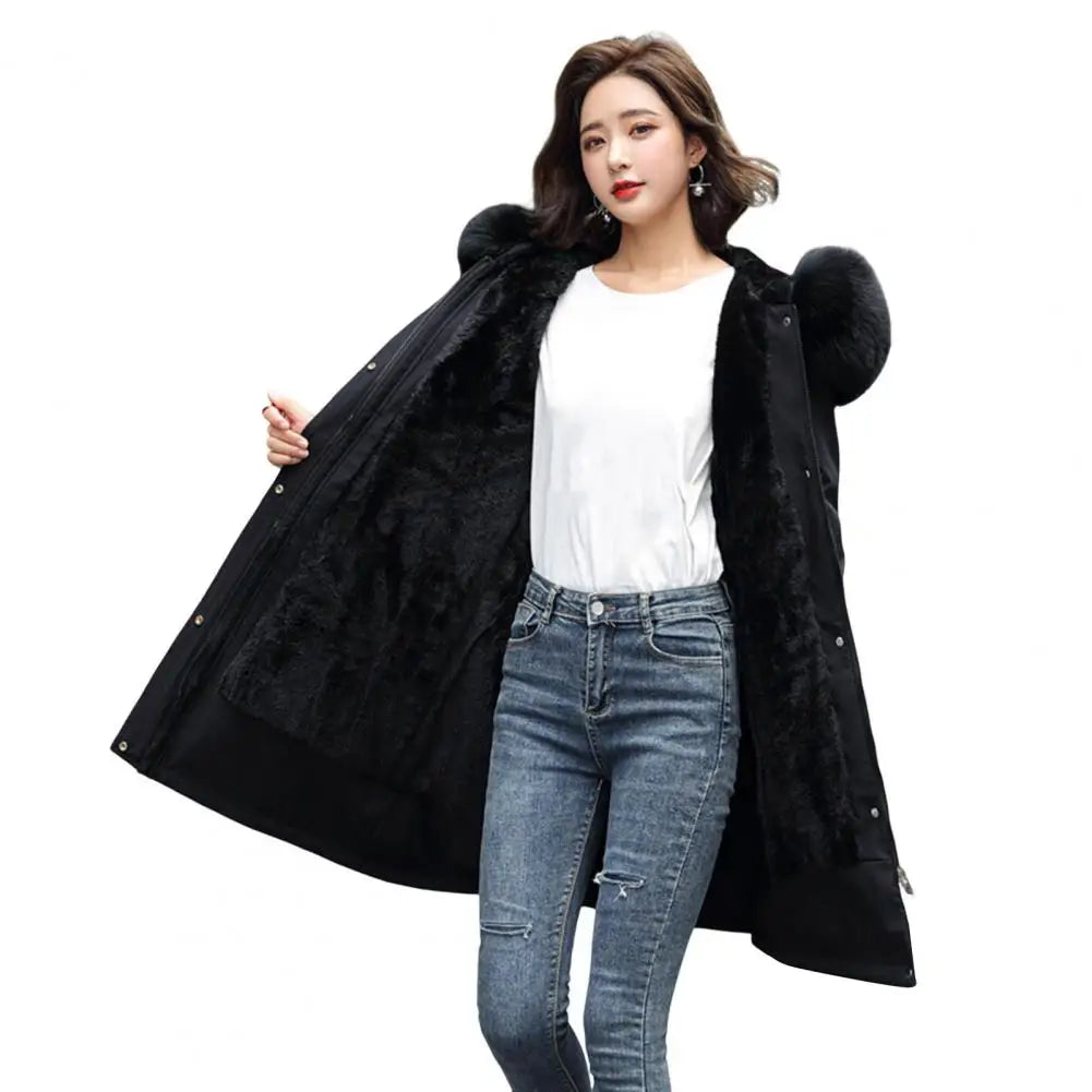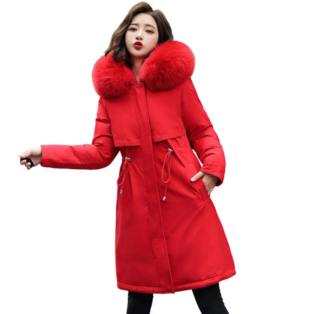 Winter Overcoat Down Coat Jacket Women Fur Furry Hood Thickened Padded Drawstring Waist Zipper Mid Length Cotton Coat