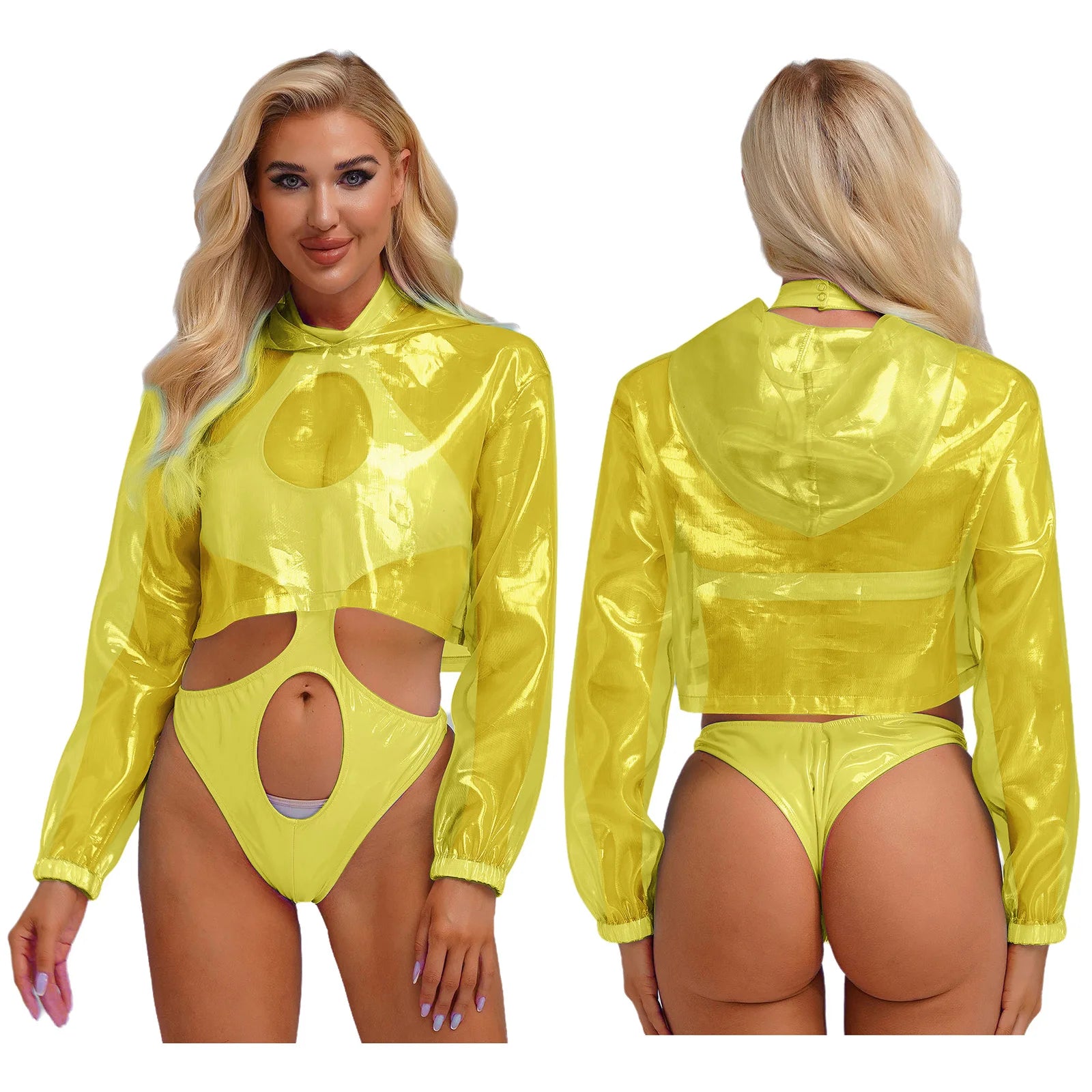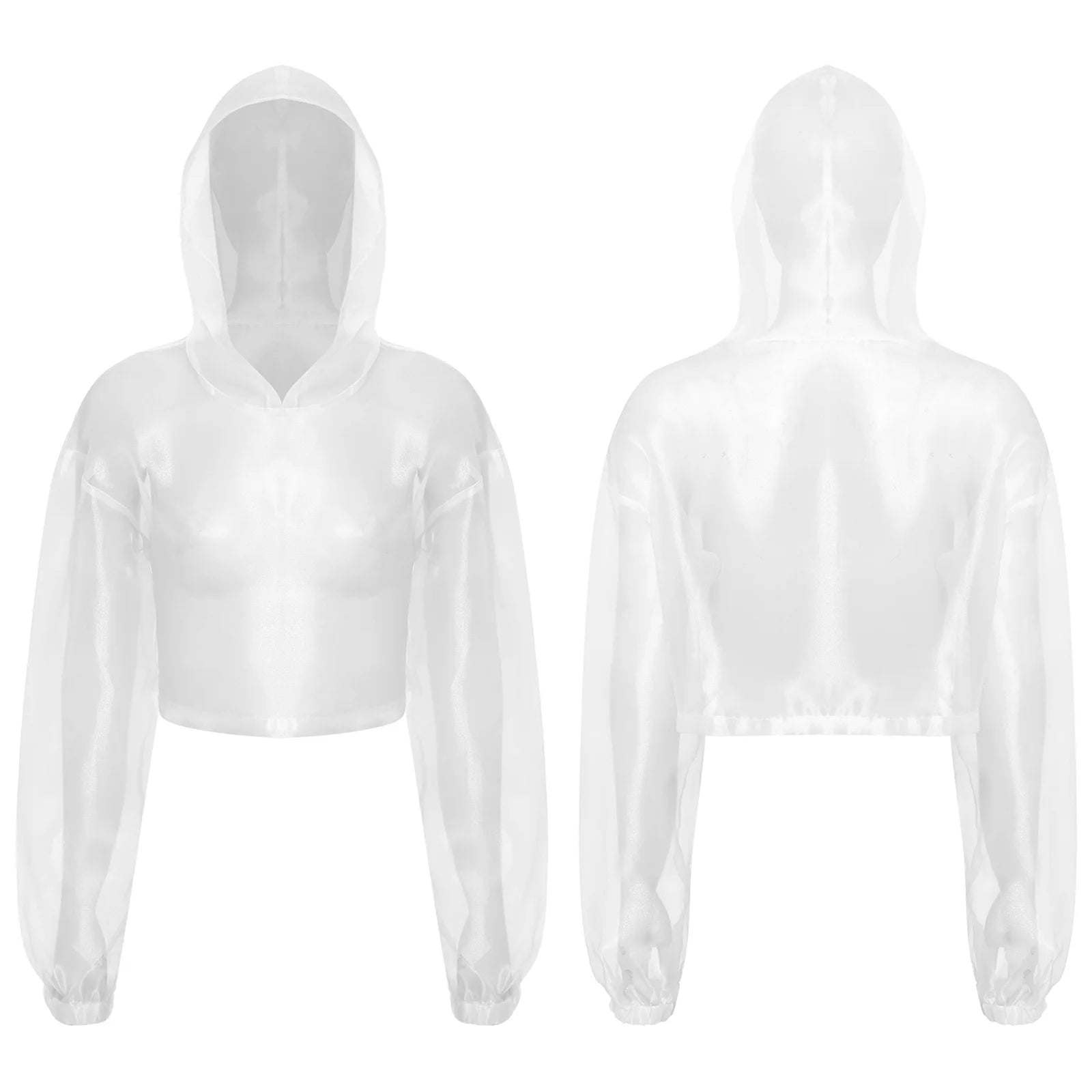 Womens Sparkly Transparent Hooded Top Holographic Long Sleeve Cropped Tee Shirts Festival Rave Outfits Pullover Hoodie Clubwear