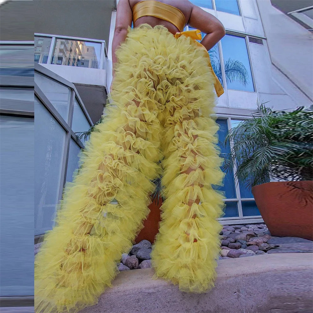 Women Solid Color Tulle Mesh Pants Woman Multi-Layer Ruffle Pants Lady High Waist Trousers Party Outfits