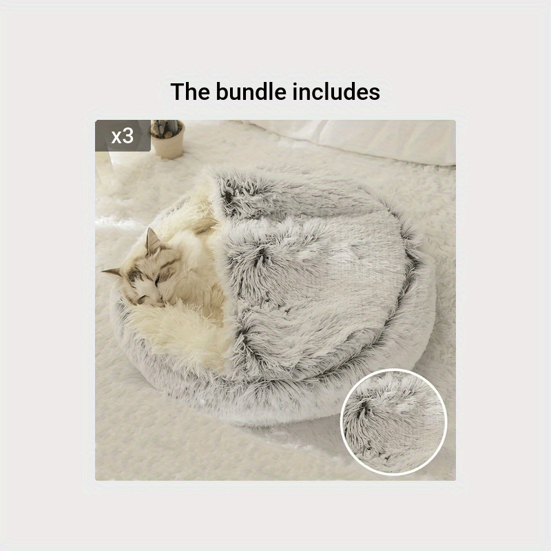 2 in 1 Round Warm Pet Bed House Polyester Cat Bed, Long Plush, Winter, with Sleeping Bag Sofa Cushion for Cat
