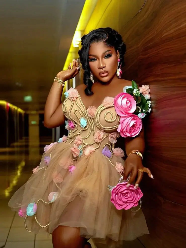 Amazing Blossom 3D Flower Short Tulle Women Party Dresses Pretty Champagne Floral A-line Tulle African Dress
