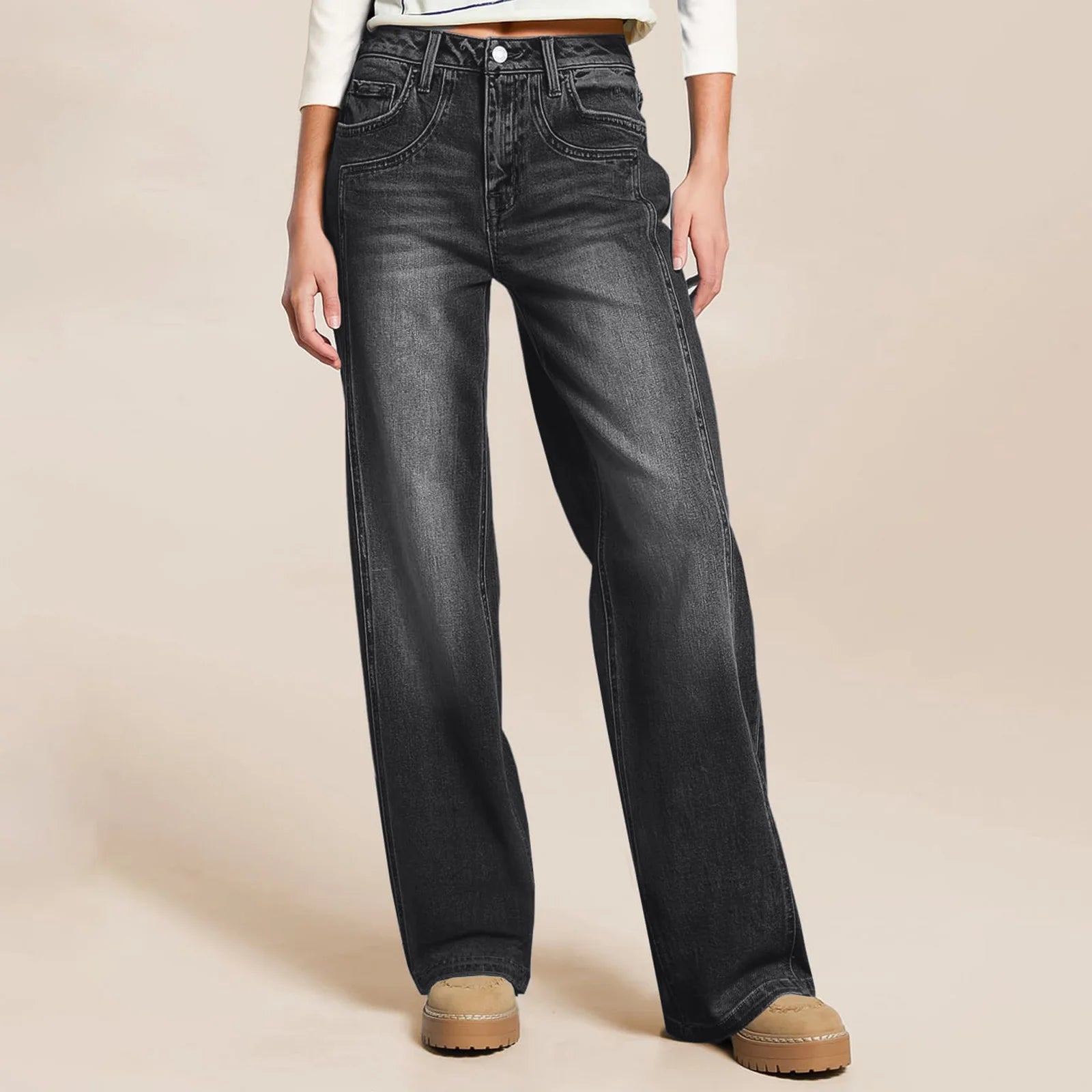BSAY Jeans for Women Fashion Autumn Winter New Solid Color Pocket Loose Retro High Waist Wide Leg Pants Chic Female Trousers