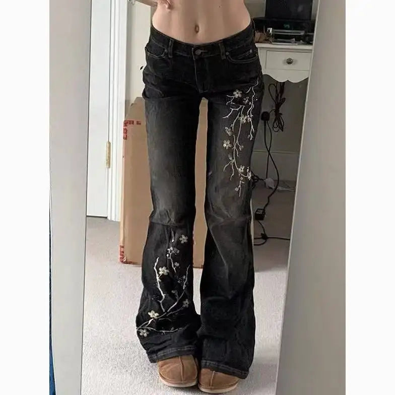 Vintage Cherry Blossom Embroidery Baggy Jeans Women Y2K Harajuku Hip Hop Casual Wide Trousers American Gothic Street Wear
