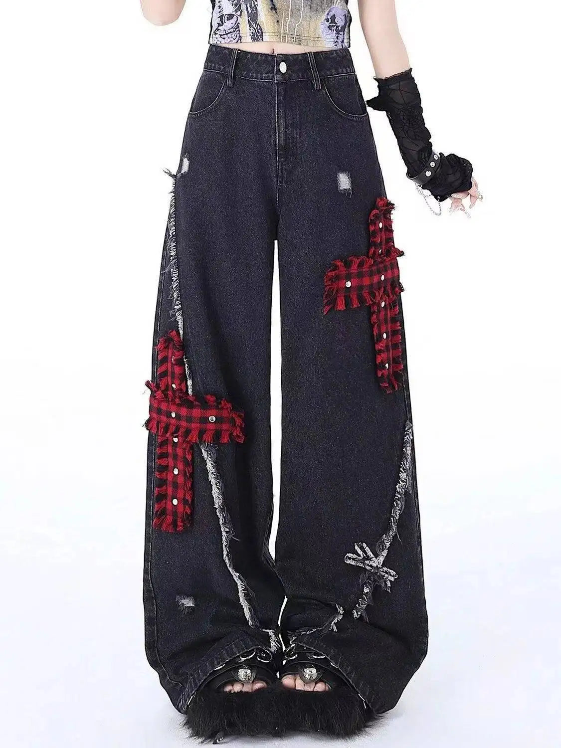 Women's Black Gothic Baggy Jeans Harajuku Y2k Aesthetic Print Denim Trousers Korean Jean Pants Vintage 2000s Clothes Design