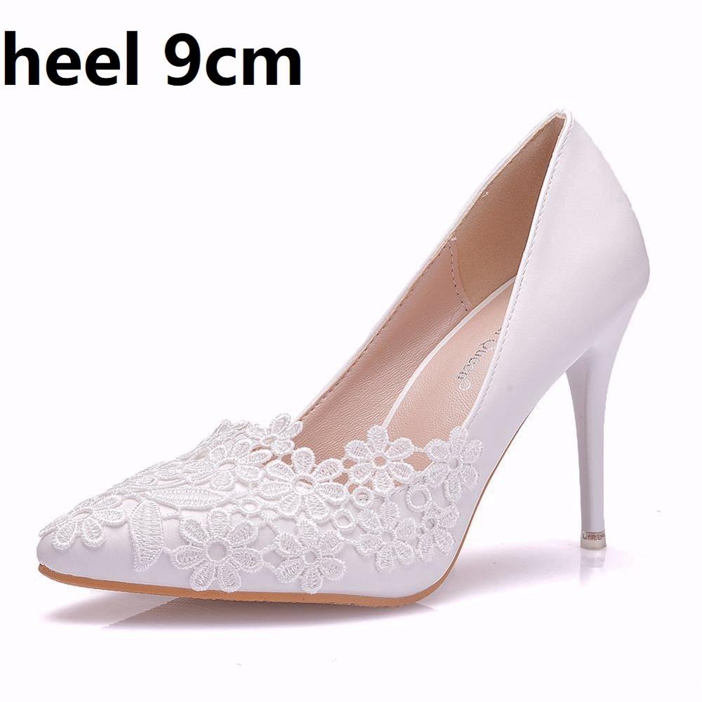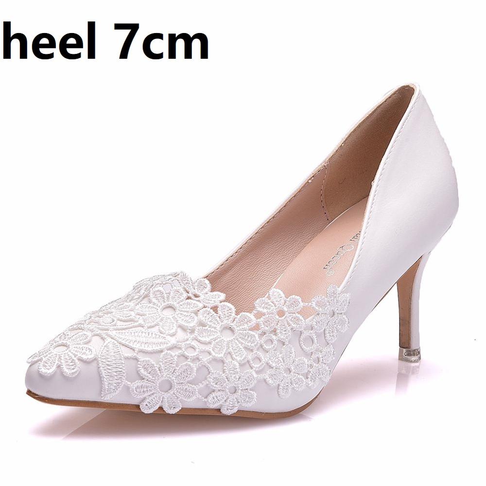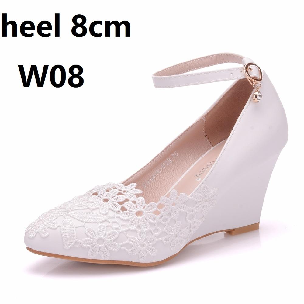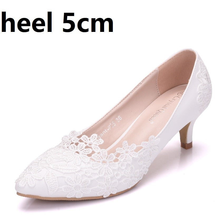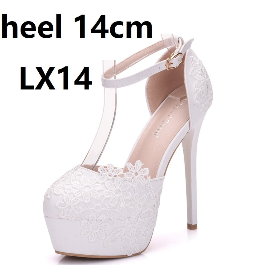 Crystal Queen White Lace Flower Pumps Womens Elegant Wedding Shoes Bride High Heels Platform Ladies Wedges Party Dress Stiletto