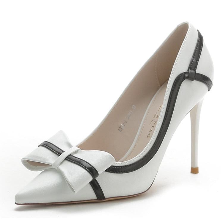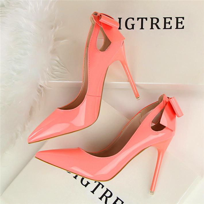 Fashion Cut-outs Bowtie Pointed Toe 10cm High Heels Solid Patent Leather Shallow Woman Party Pumps Office Ol Shoes Woman